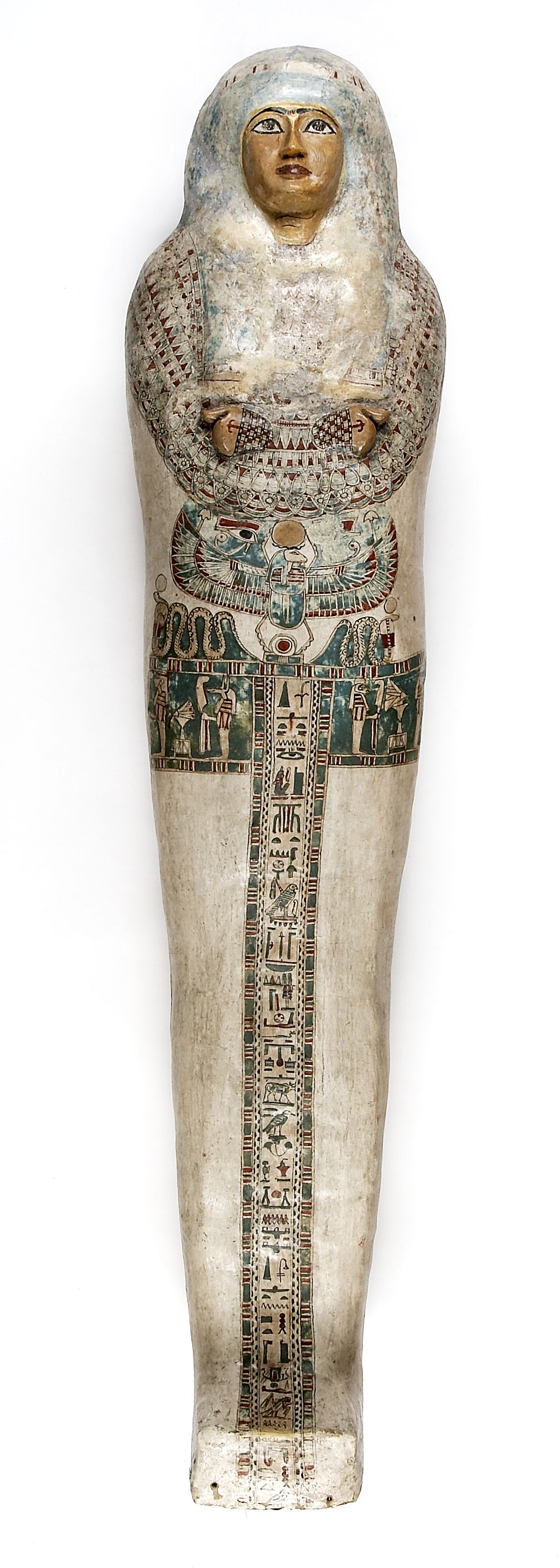 Šlo o osobu vyššího společenského postavení. Mumie již dvakrát prošla radiologickými vyšetřeními: první se uskutečnilo na počátku 70. let minulého století, druhé na sklonku prvních let 21. století. Vyšetření mimo jiné prozradila, že žena zemřela mezi 20. a 30. rokem života. Tělo je zabaleno v malované kartonáži a uloženo ve dvou dřevěných rakvích z cedrového dřeva, které zdobí půvabné portréty. Samotné ostatky chrání původní přiléhavý, dobře zachovalý obal z obinadel, zbytků papyrů, dřeva a štukovací omítky. Tento kartonážový krunýř je podle odborníků výjimečně bohatě zdobený a celkově vydařený. Jsou na něm zobrazeny náboženské výjevy, které se vztahují k posmrtnému životu.