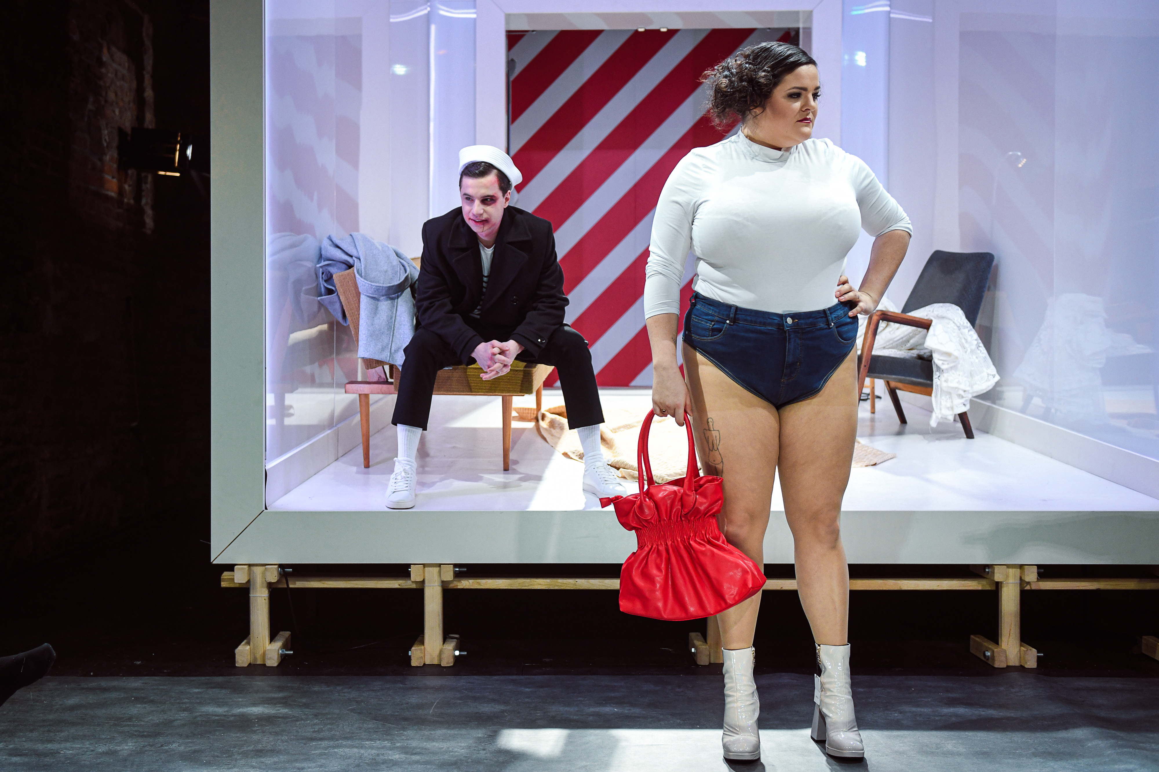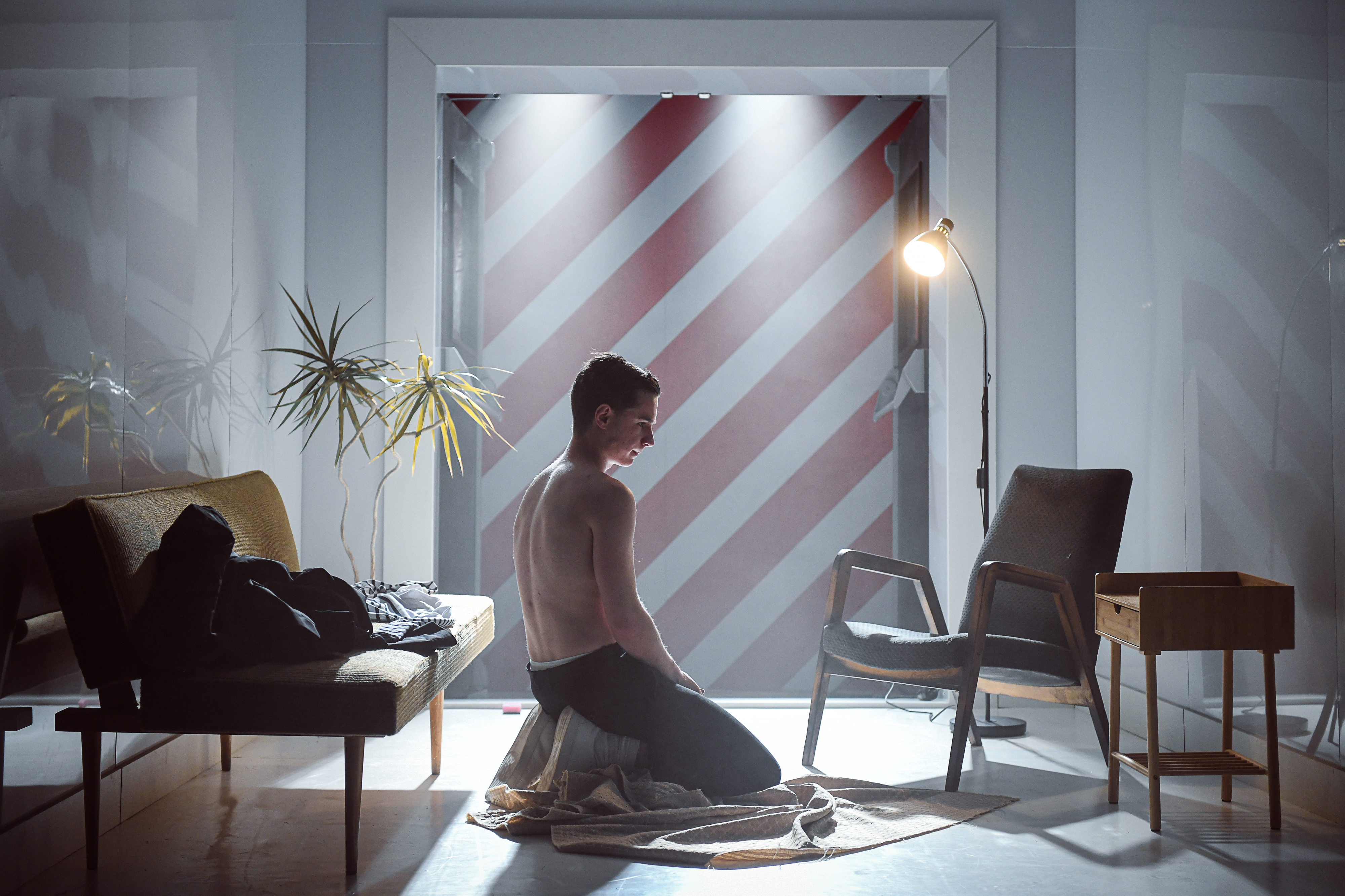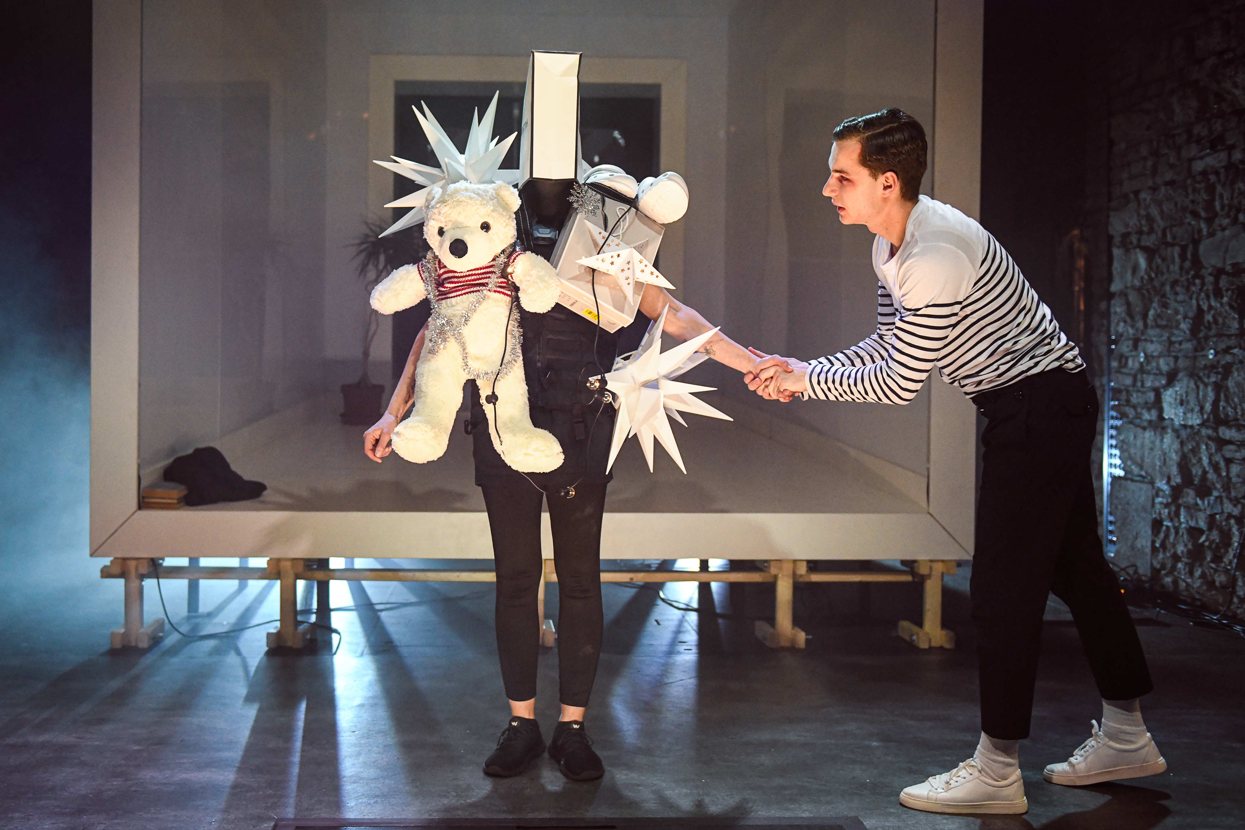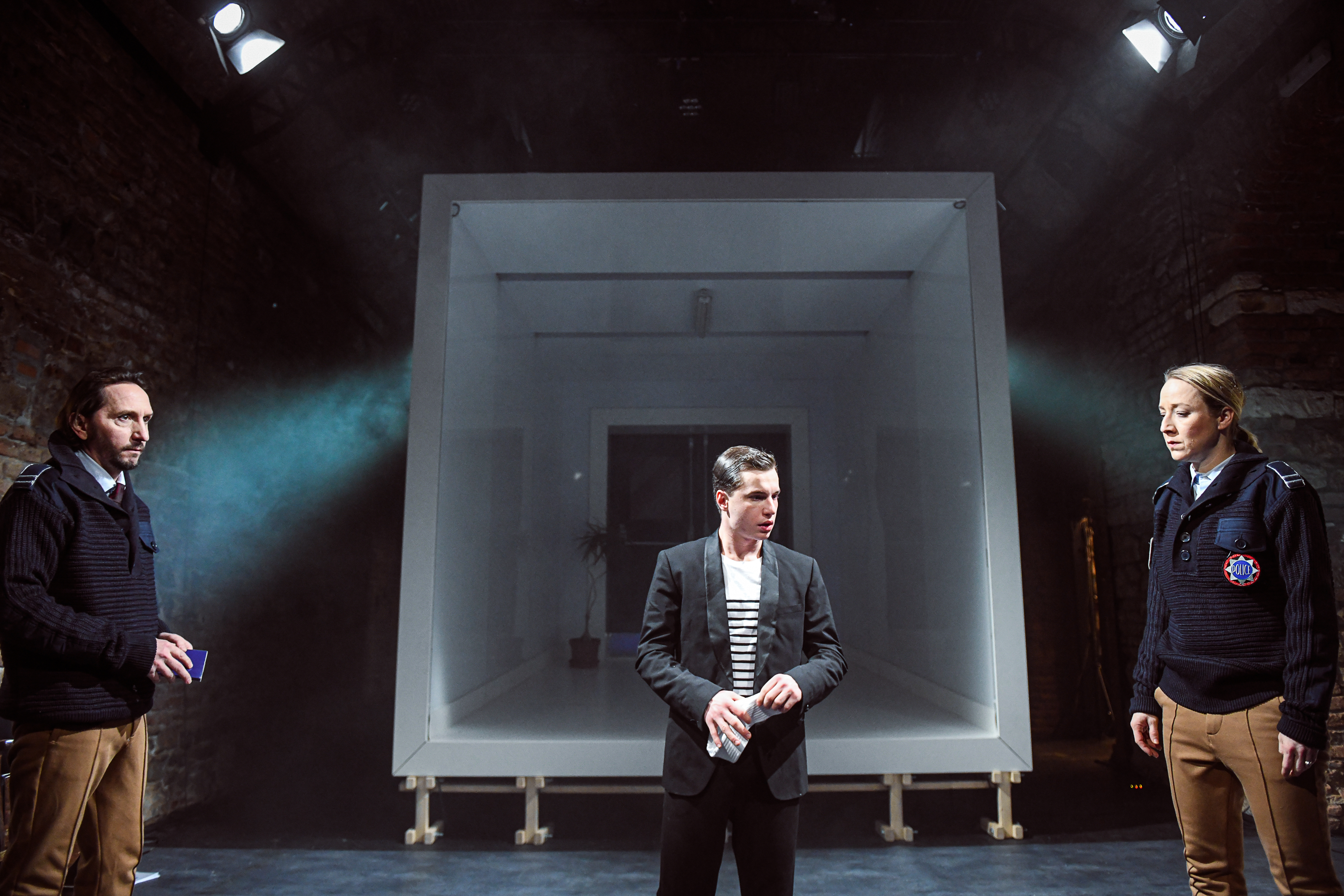 Prostor pro fantazii a nalézání dalších významů nabízí i výtvarná složka inscenace. Scéně Petra Vítka vévodí lesklý bílý pokoj. Z něj se napadený mladík snaží vymazat všechny vzpomínky na útočníka, podobně jako se je snažil vytěsnit ze své paměti. Postupem času však v prostoru přibývá čím dál více lidí, kteří se k jeho případu vyjadřují, a s nimi i černých stop… Téma pošpinění a prolomení křehkých hranic osobního prostoru připomíná také použití červeno-bílé policejní pásky určené pro označení místa činu.
