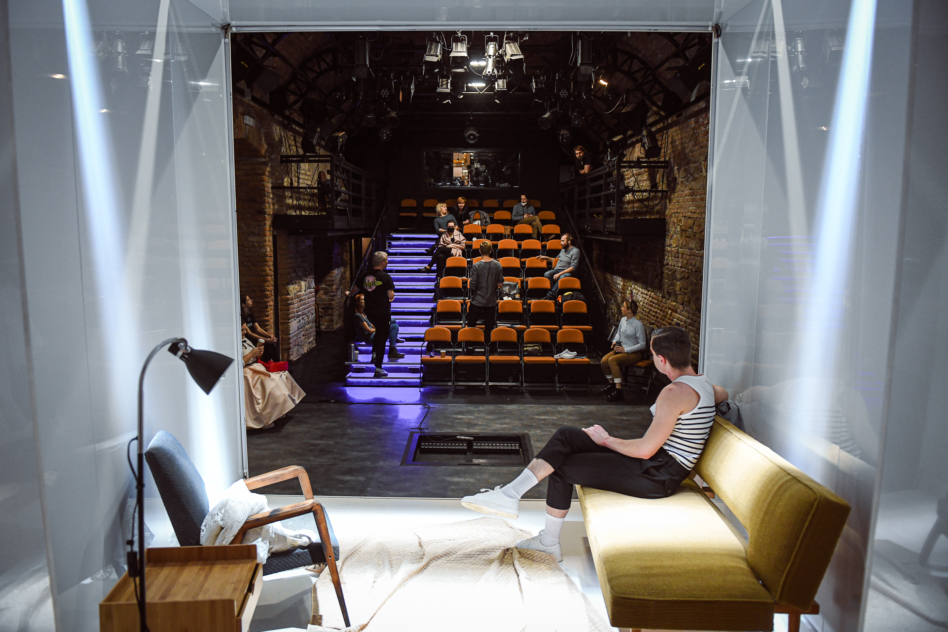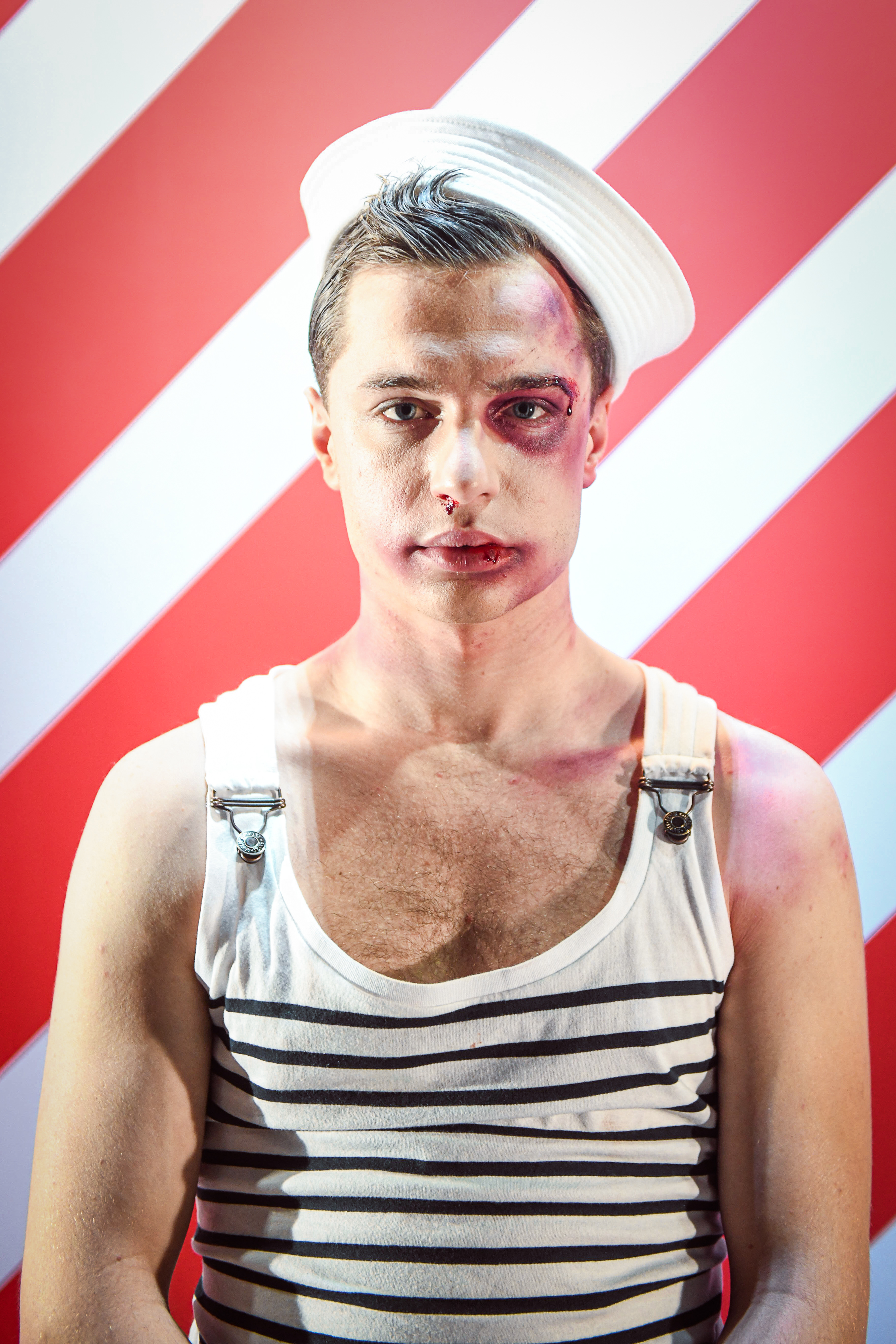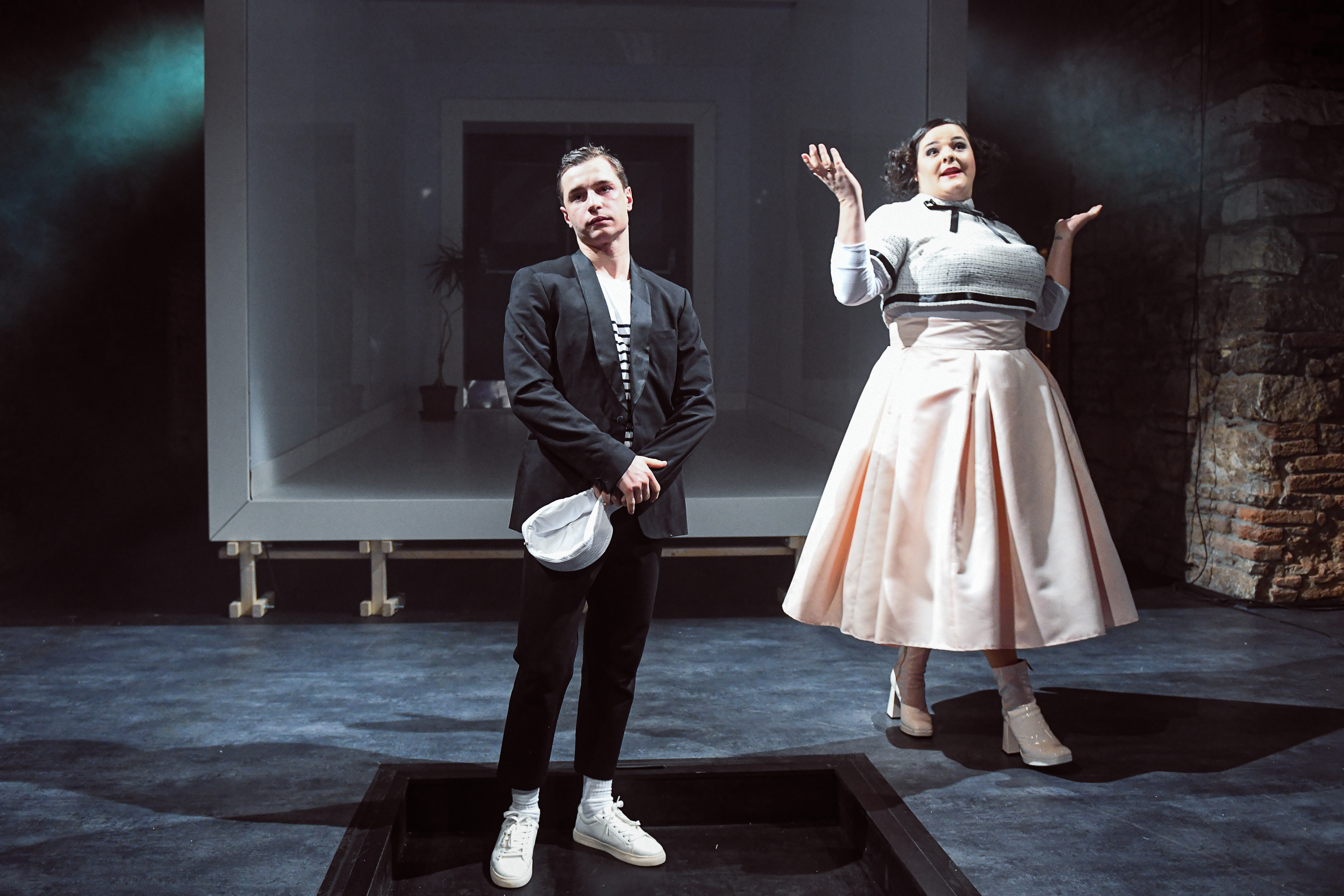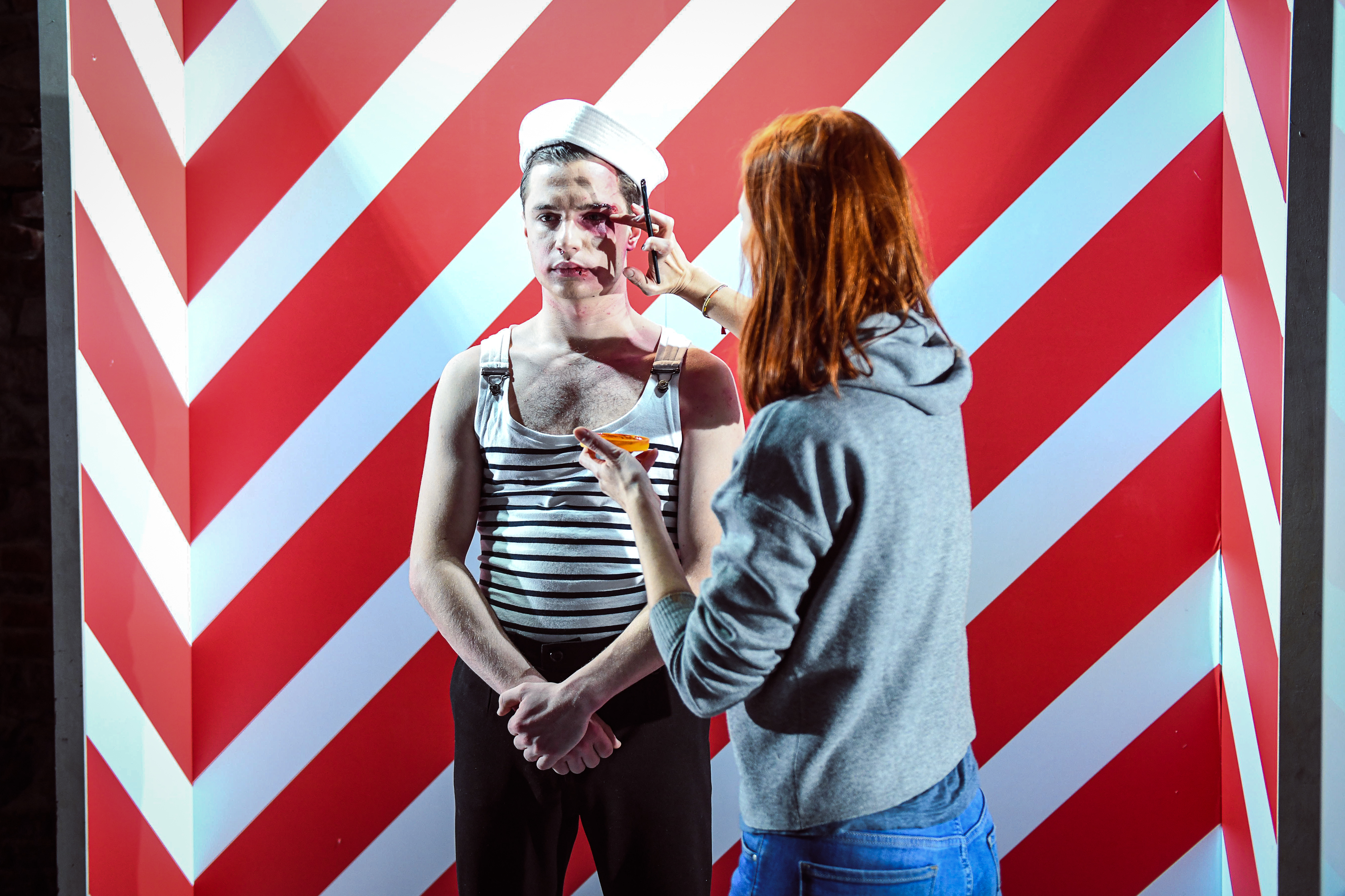 Prostor pro fantazii a nalézání dalších významů nabízí i výtvarná složka inscenace. Scéně Petra Vítka vévodí lesklý bílý pokoj. Z něj se napadený mladík snaží vymazat všechny vzpomínky na útočníka, podobně jako se je snažil vytěsnit ze své paměti. Postupem času však v prostoru přibývá čím dál více lidí, kteří se k jeho případu vyjadřují, a s nimi i černých stop… Téma pošpinění a prolomení křehkých hranic osobního prostoru připomíná také použití červeno-bílé policejní pásky určené pro označení místa činu.