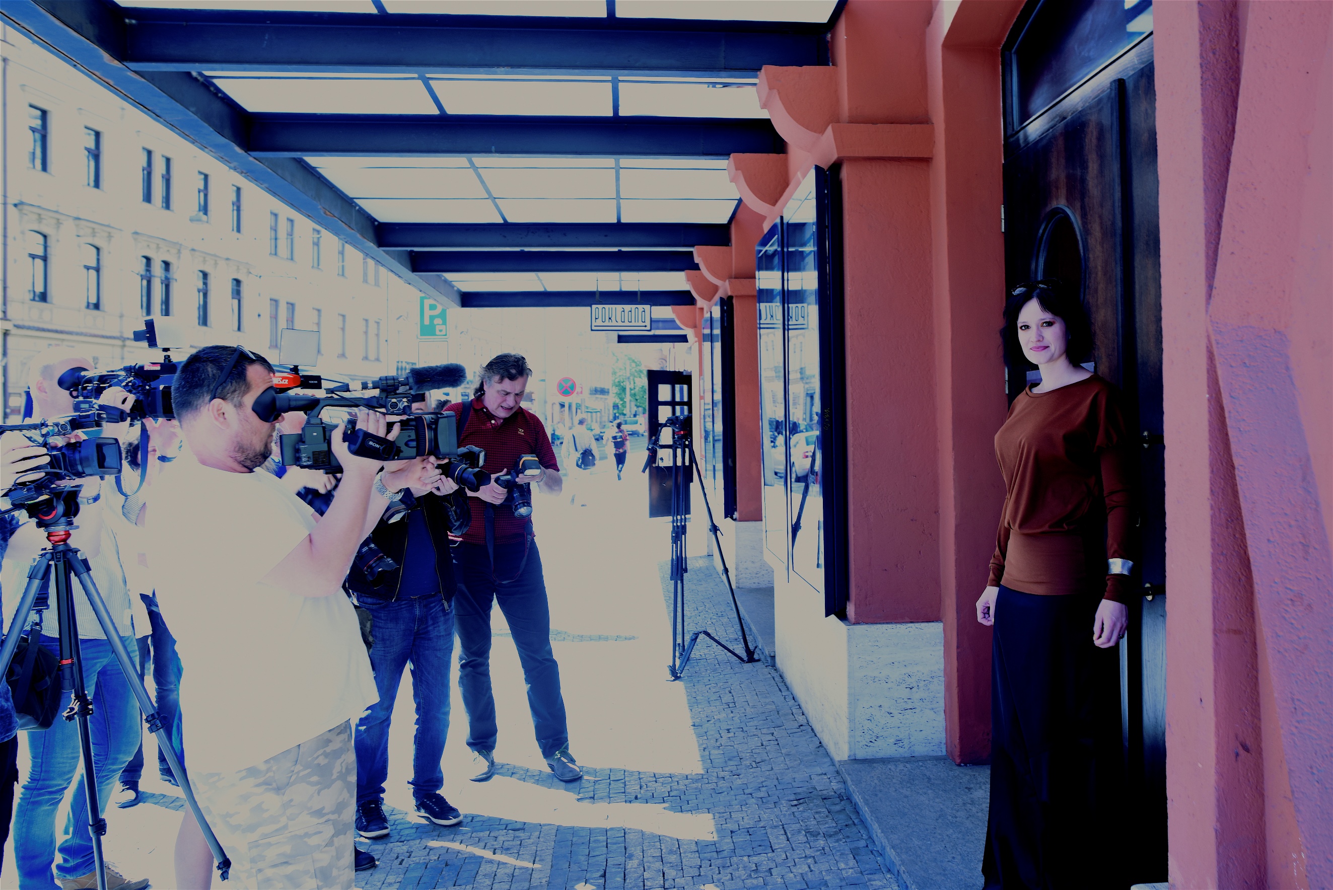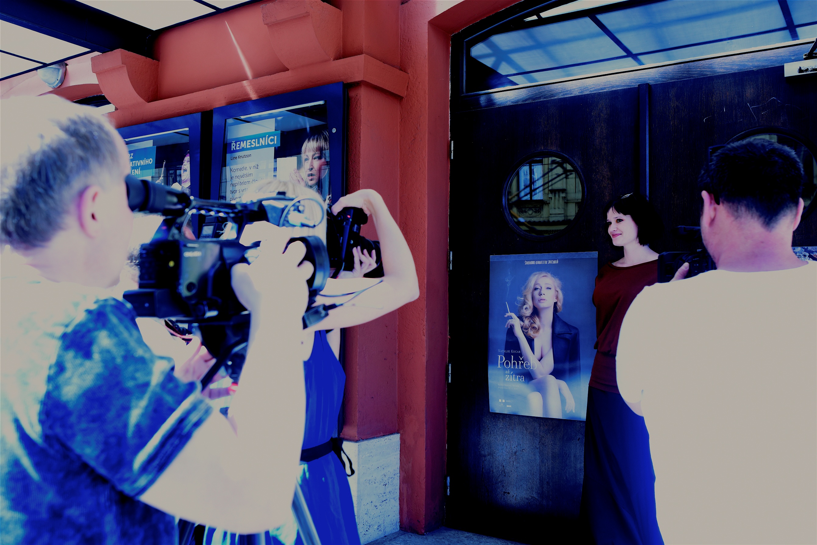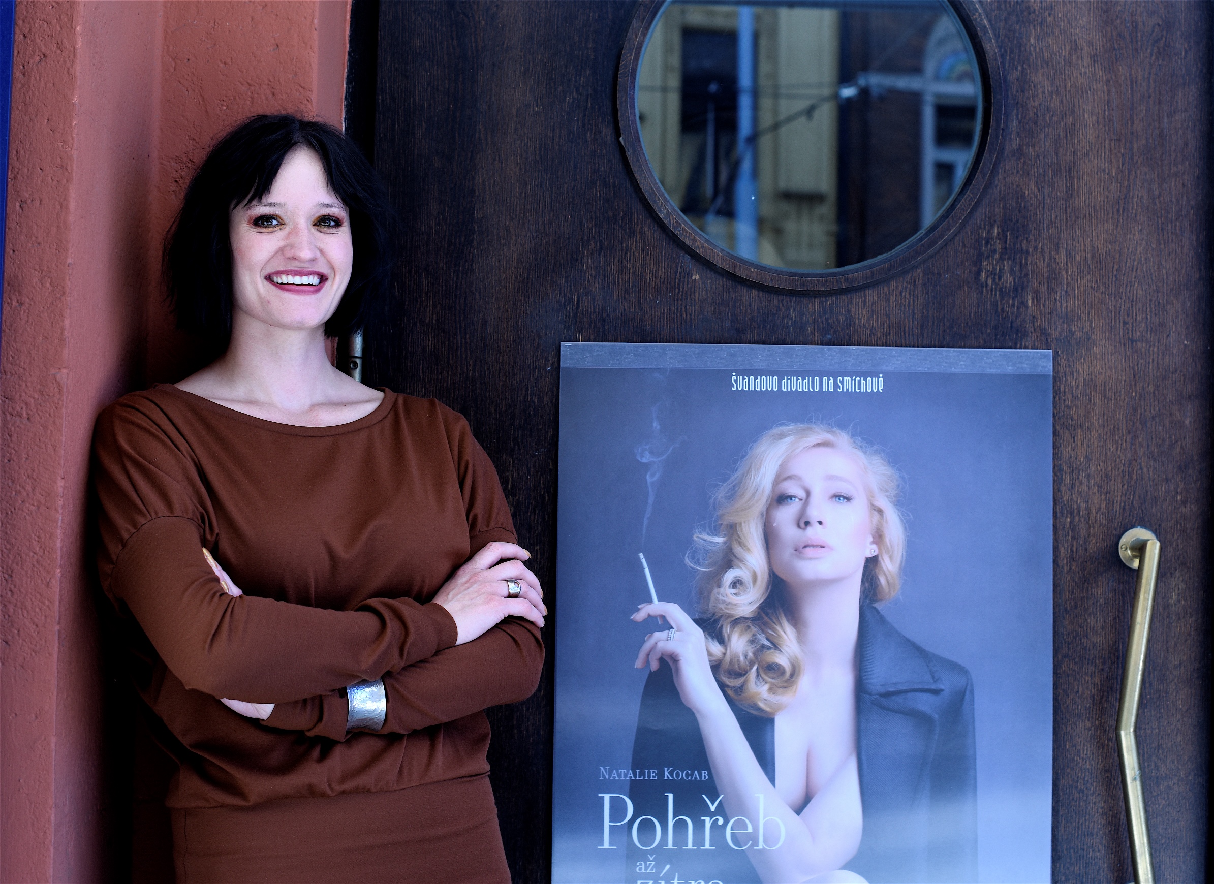 1_Natálie Kocábová s plakátem její nové hry Pohřeb až zítra_foto Alena Hrbková repro zdarma