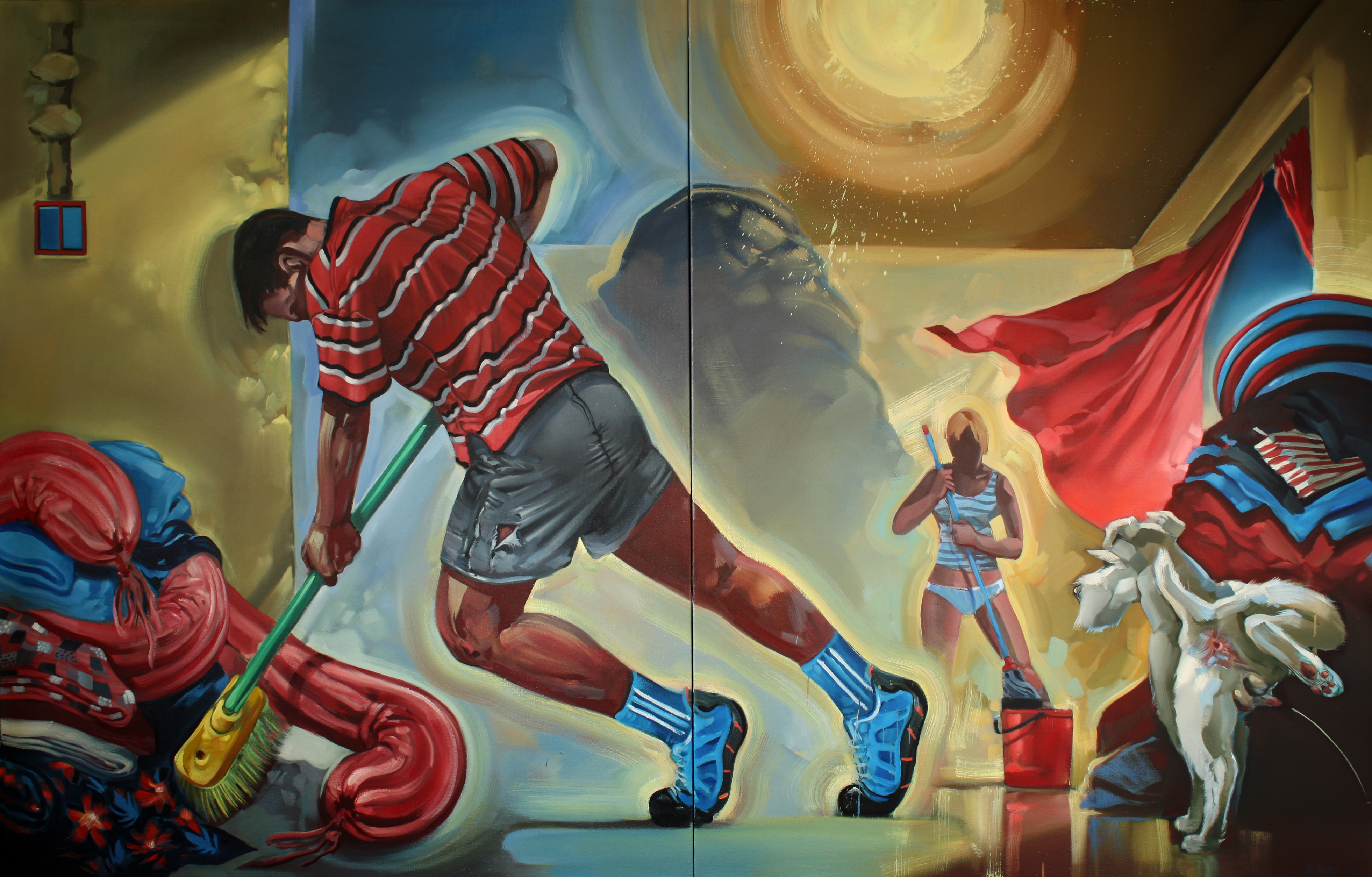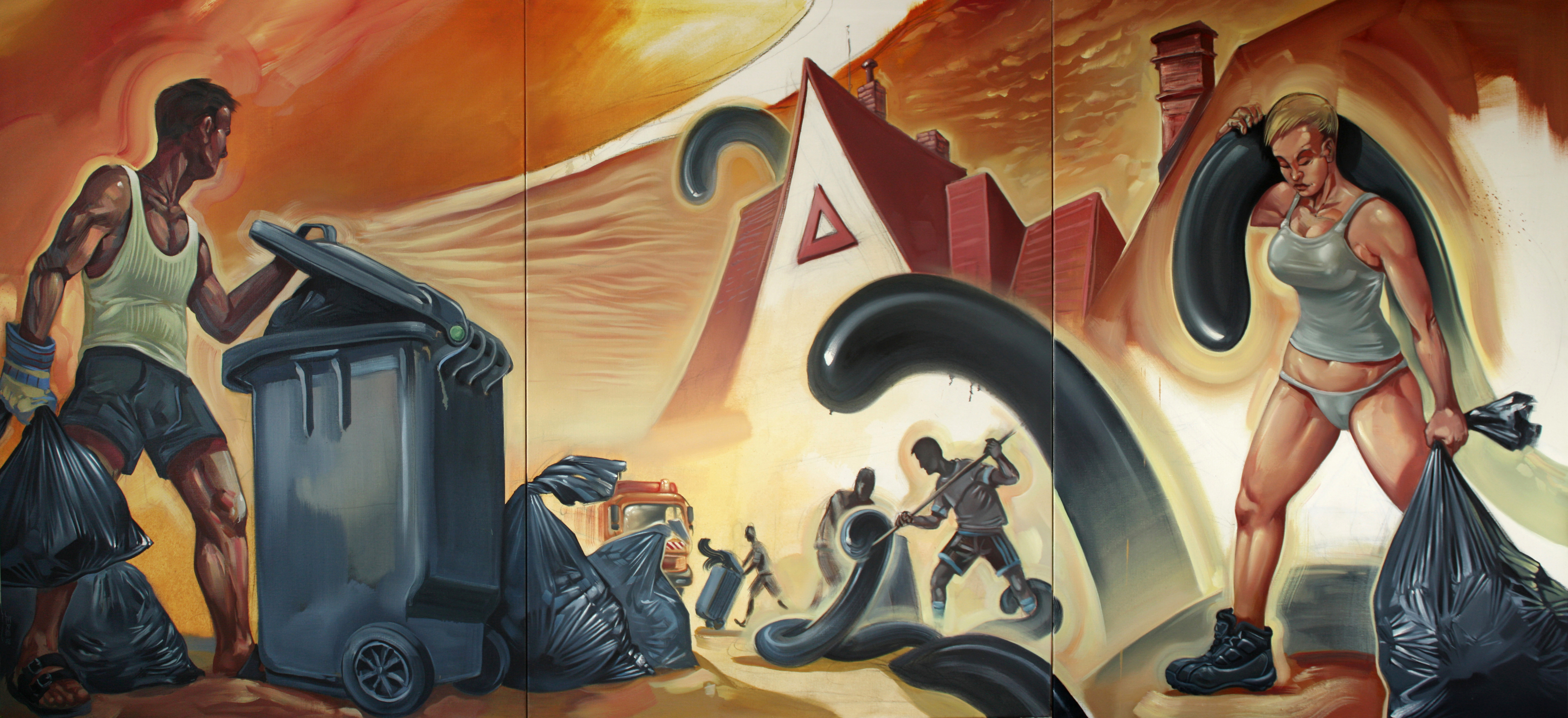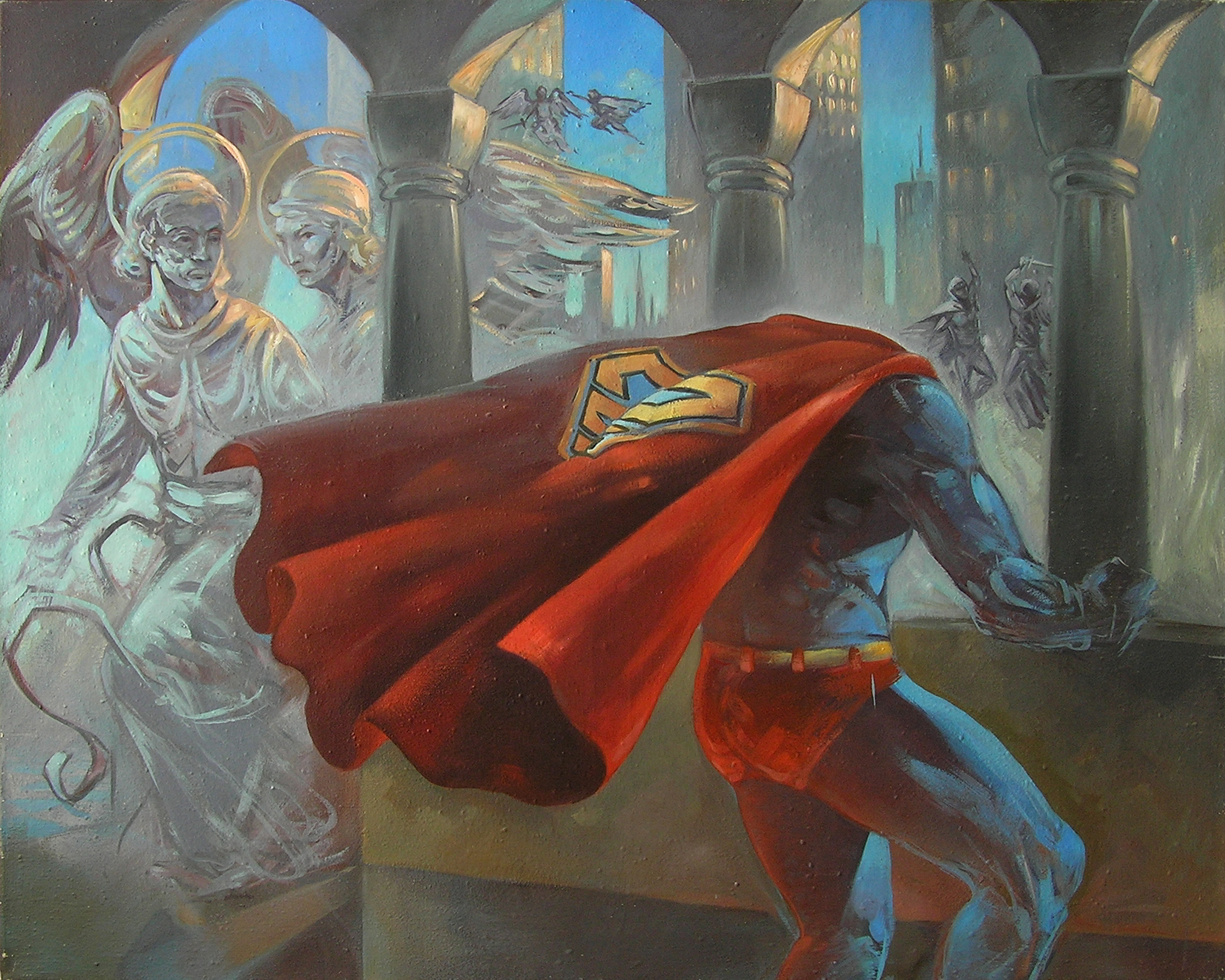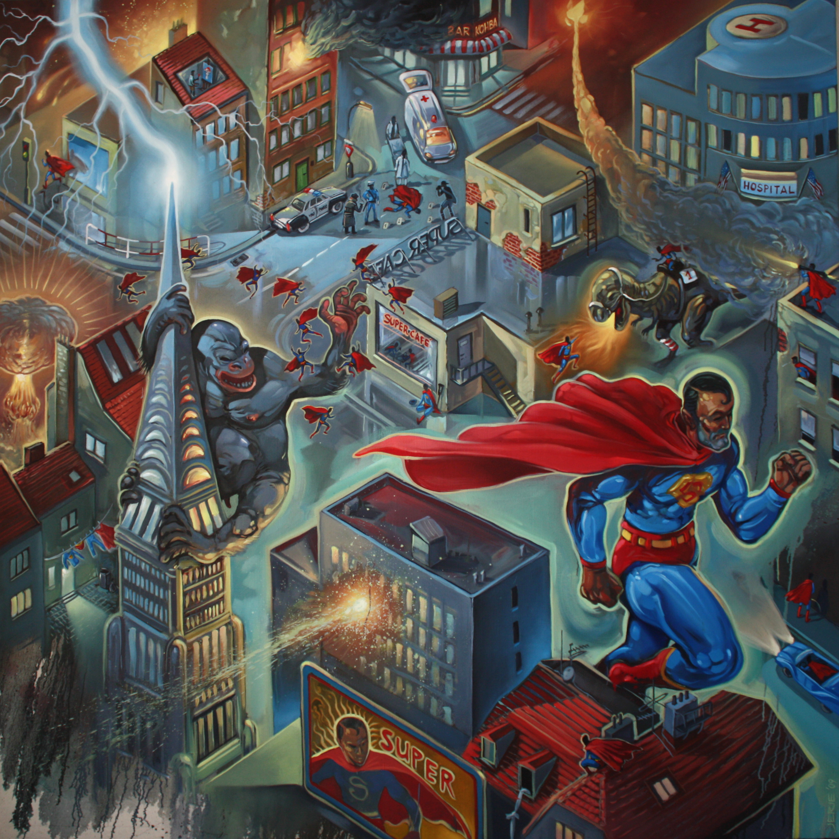 Autorovy  „XL“ obrazy o rozměrech až dvakrát čtyři metry se představí hned v přízemí Galerie Portheimka. Zde tu také čeká na návštěvníky nedokončený komiksový příběh. Anděla procházejícího pražským Smíchovem. „Kdo bude chtít, může Andělův příběh dokreslit a dát mu tak život podle vlastní fantazie,“ říká Karel Jerie.