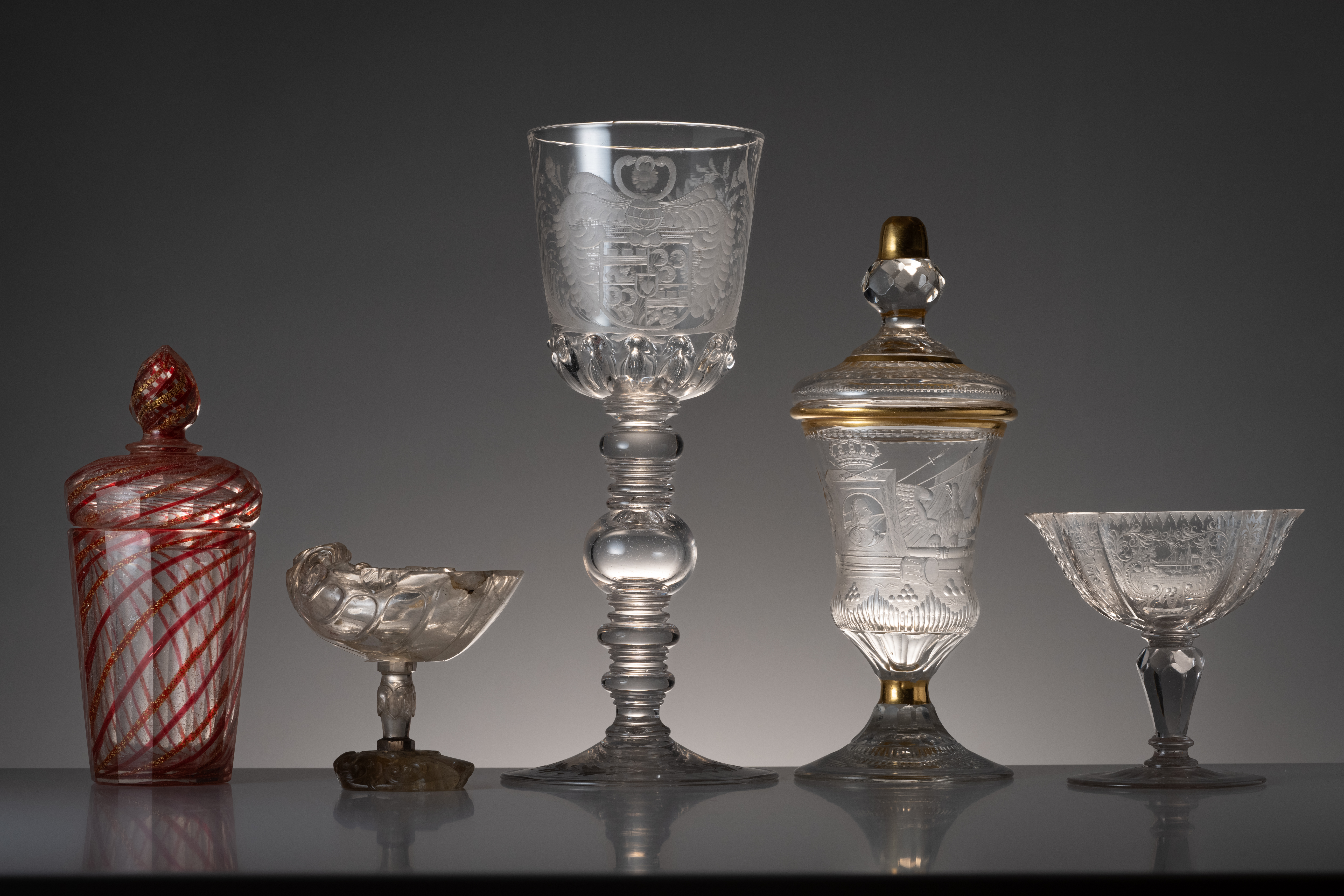 K top položkám aukce patří dále přes 400 let stará manýristická číše z horského křišťálu z Lobkovické sbírky s vyvolávací cenou 15 000 korun. Znalce nejspíš zaujme i barokní „lodička“, skleněný pohár na cukrovinky, zdobený rytinami a vyrobený v 1. polovině 18. století (od 5 000 korun). Ze stejného období je i rytý a zlacený barokní pohár s víkem pocházející z německé Postupimi (od 10 000 korun). Výjimečným kusem je rovněž menší pohárek s víkem vyrobený okolo roku 1700 v Čechách, jehož stěnami prochází spirála z rubínového skla (od 10 000 korun).