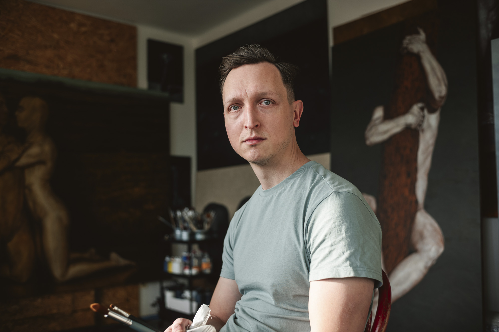 „Katalyzátorem mé aktuální tvorby byly pojmy jako vyhořet, pohořet, ale i pro něco zahořet a vzplanout,“ vysvětluje Adam Šakový, na Slovensku respektovaný umělec propojující bravurní techniku s naléhavými společenskými a osobními tématy. „Oheň jeví znaky živého i neživého. A i vztah, na jehož začátku přeskočí jiskra může být živý, může doutnat a může i vyhasnout. Ale můžeme se ho pokusit znovu rozdmýchat. S ohněm tedy pracuji v malbě tak, jak s ním pracuji v jazyce – v jeho celé významové šíři,“ říká Šakový.