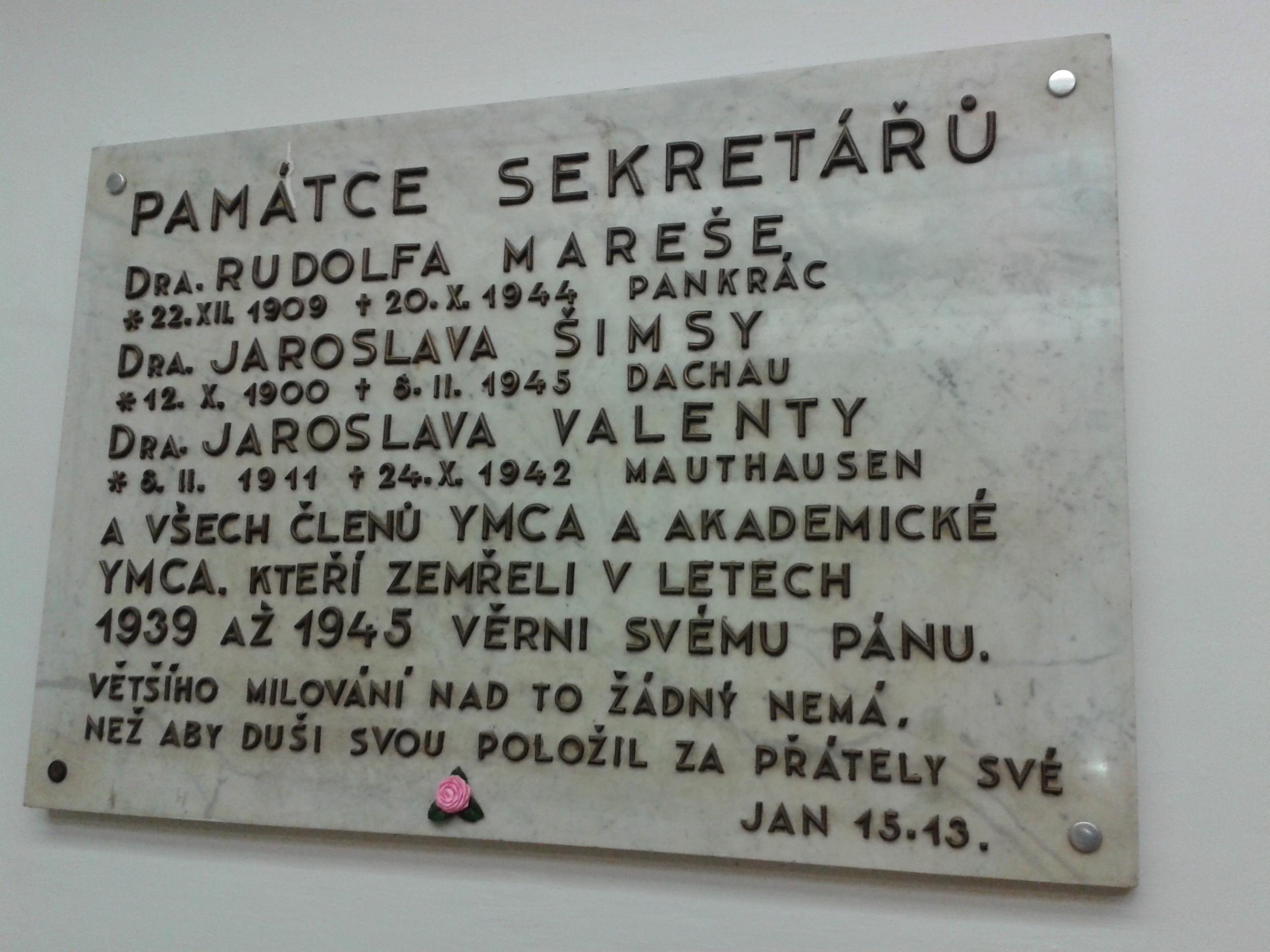 Památku Jaroslava Valenty spolu s jeho dalšími kolegy z YMCA, kteří za svou činnost zaplatili během druhé světové války životem, tu dodnes připomíná pamětní deska umístěná v přízemí Paláce.