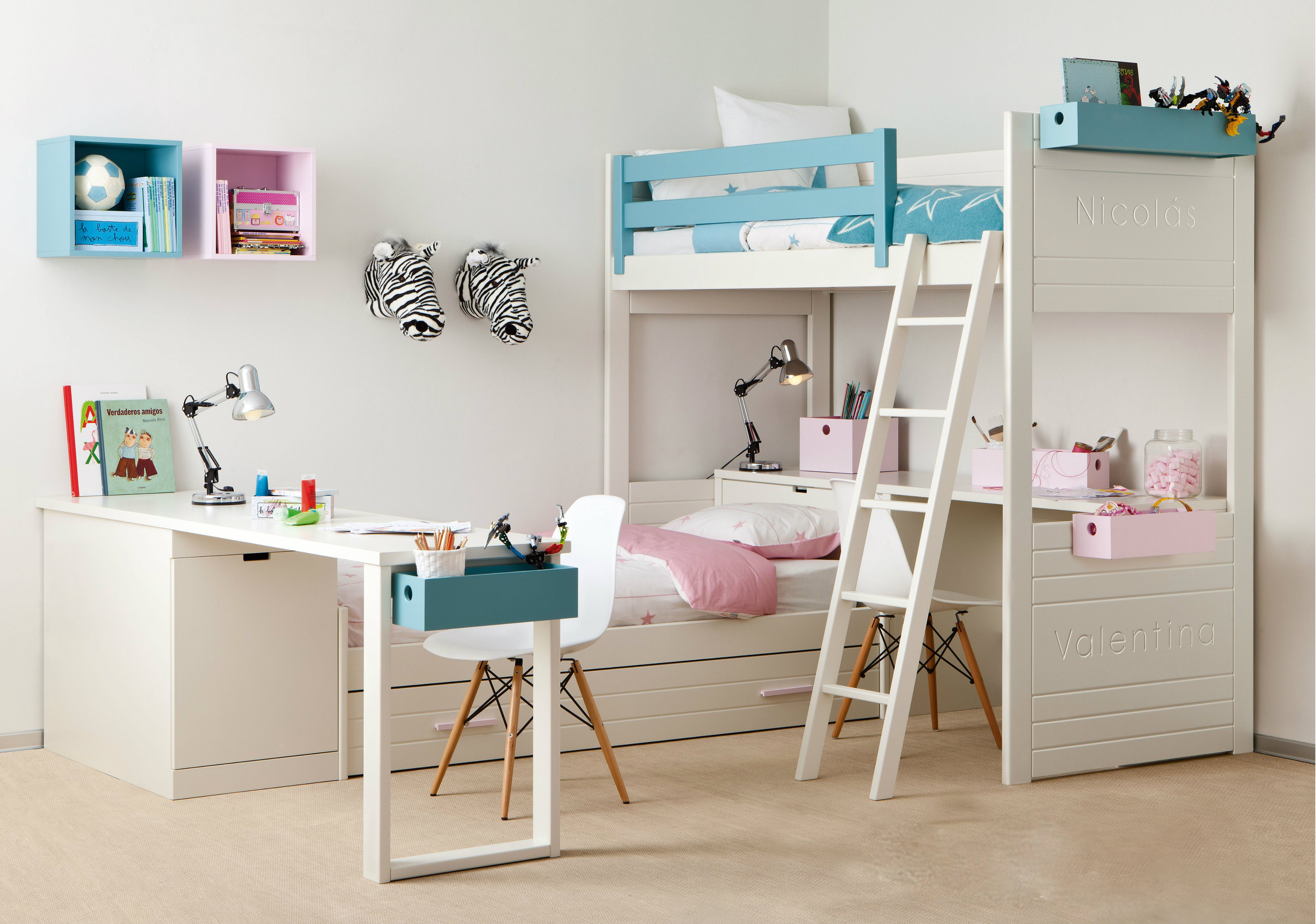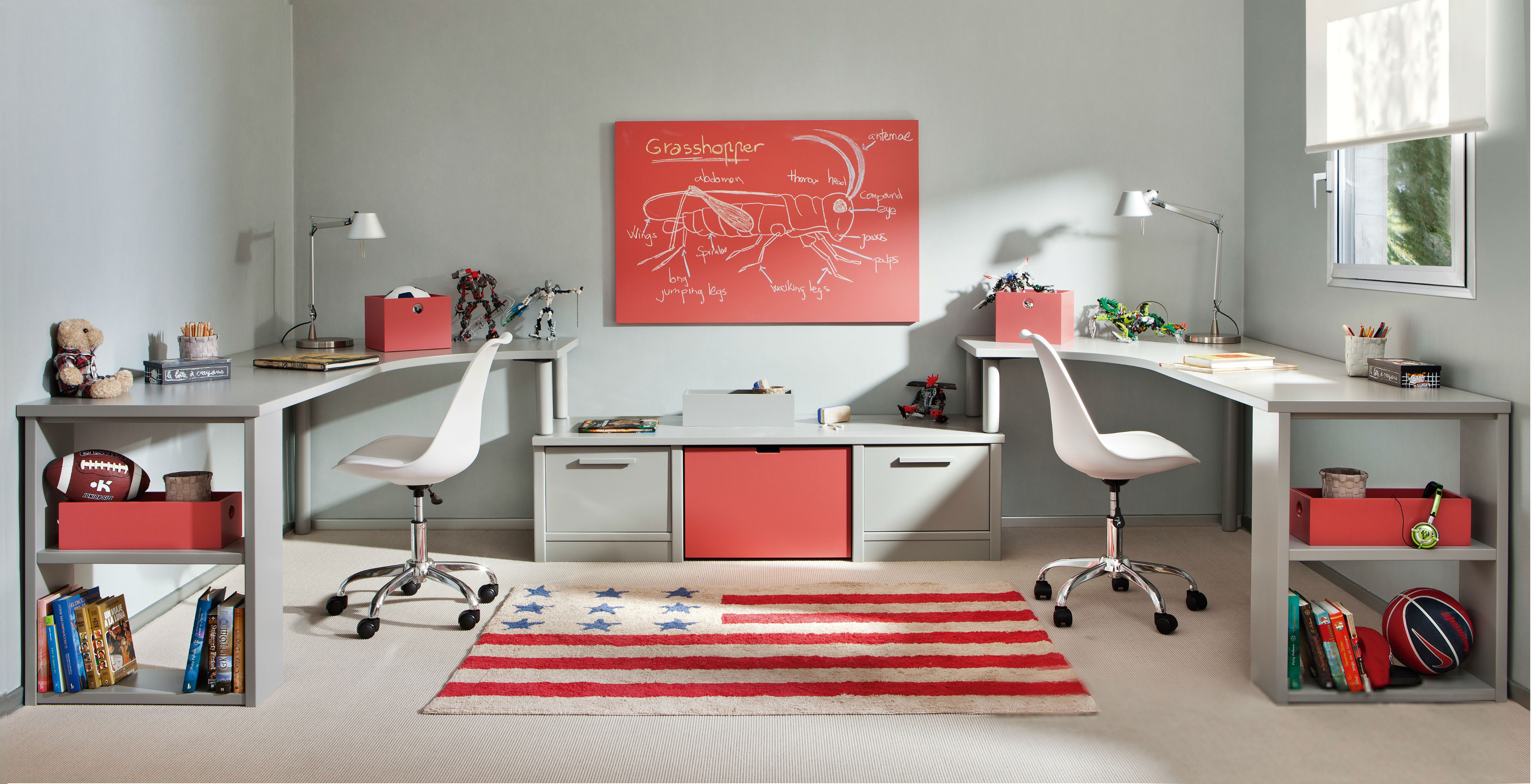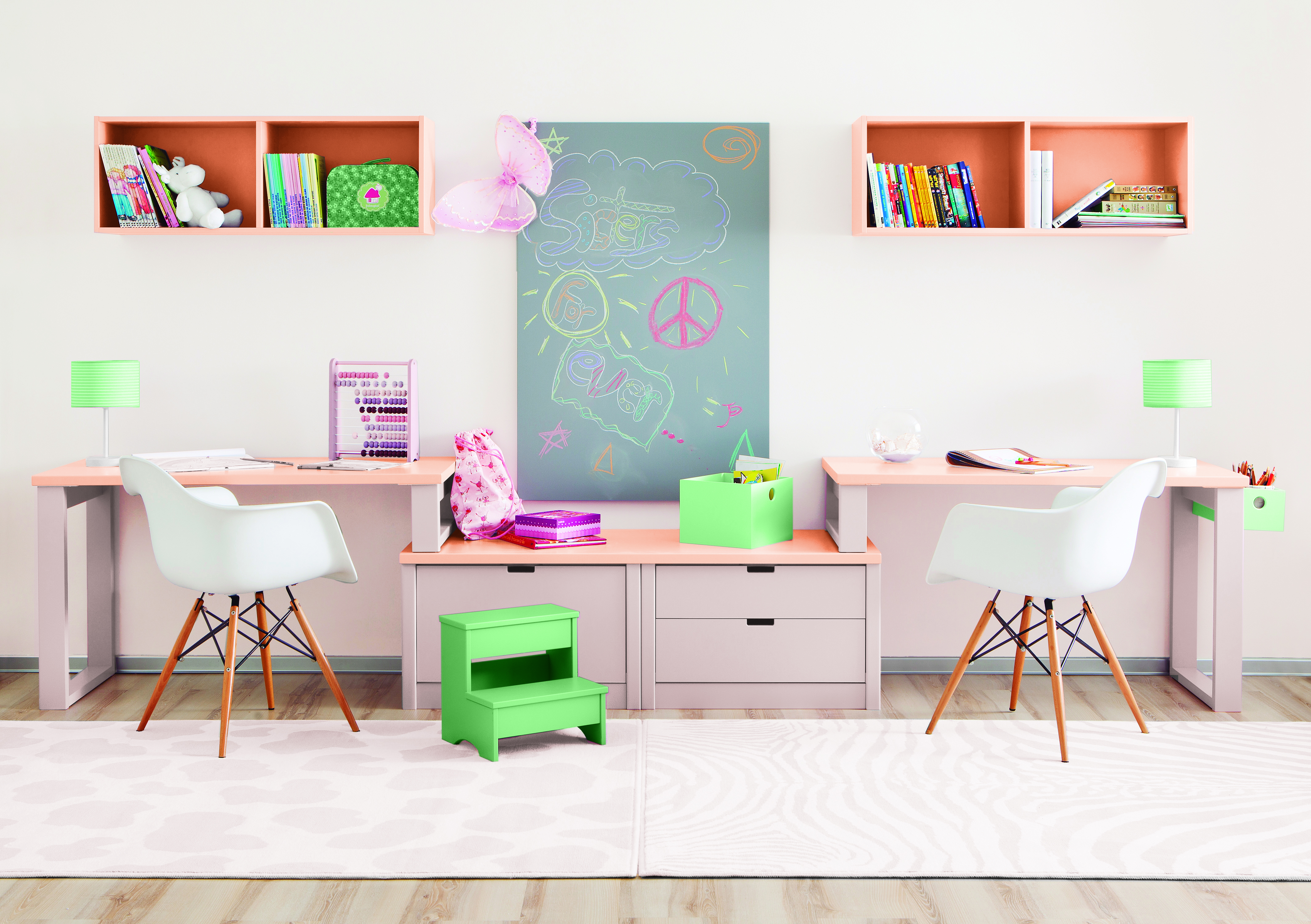 V pokojíčku sourozenců či dvojčat se pak vždy vyplatí pracovní zóny alespoň opticky či barevně rozdělit, aby se zabránilo zbytečným strkanicím.