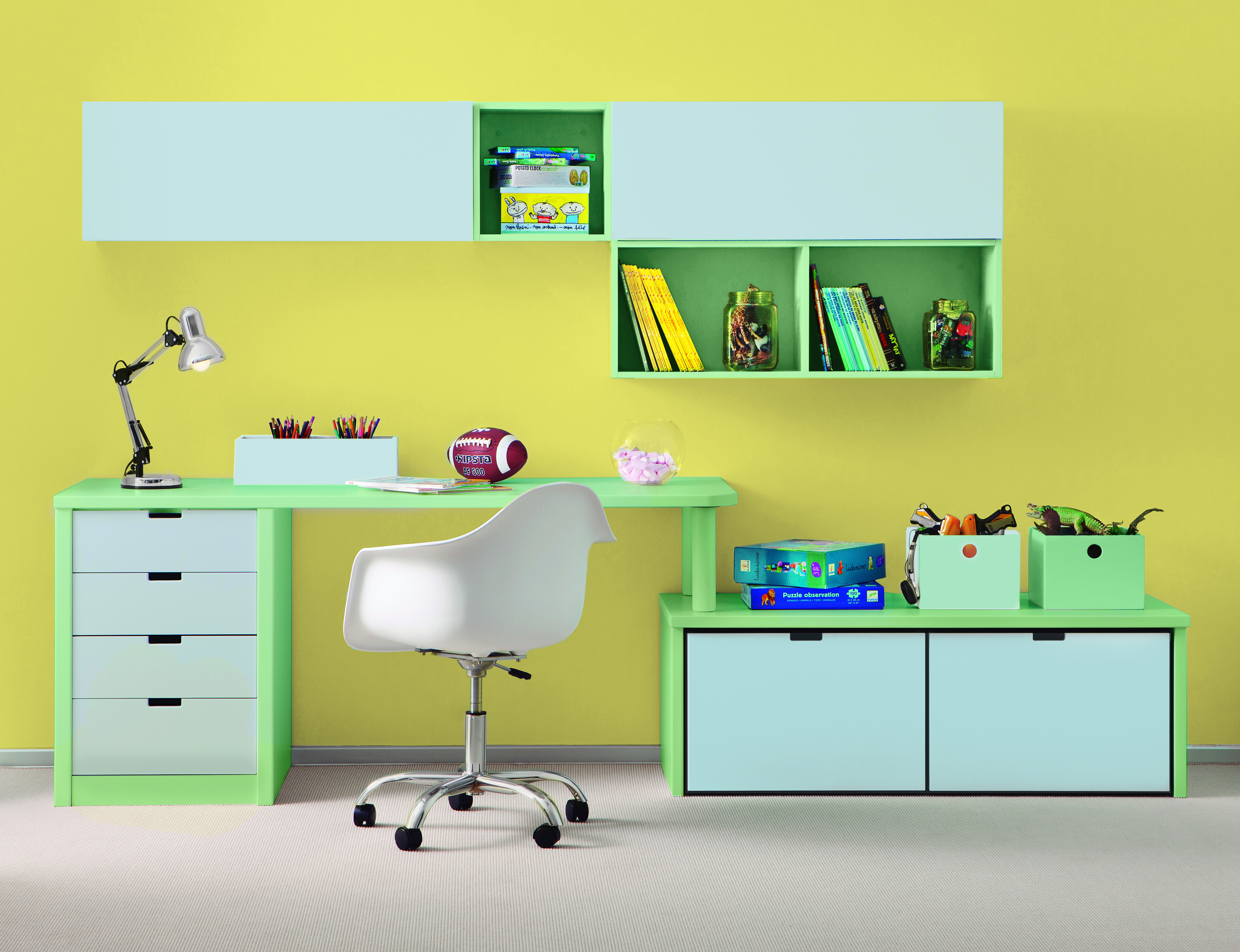 „Zejména u prvňáčka a menších školních dětí se vyplatí uvážit, jestli se ke stolu vejde i židle pro mámu nebo tátu: jinak budete s psaním úkolů zbytečně zápasit za vysokým kuchyňským stolem,“ říká Šárka Richtrová, která si oblíbila španělský nábytek značky Asoral – z dřevěného masivu, takže vydrží pěkný mnoho let, s možností postupného dokupování dalších prvků tak, jak děti rostou, a ve škále čtyřiadvaceti pastelových barev, ze kterých lze vytvářet krásně sladěné kombinace.