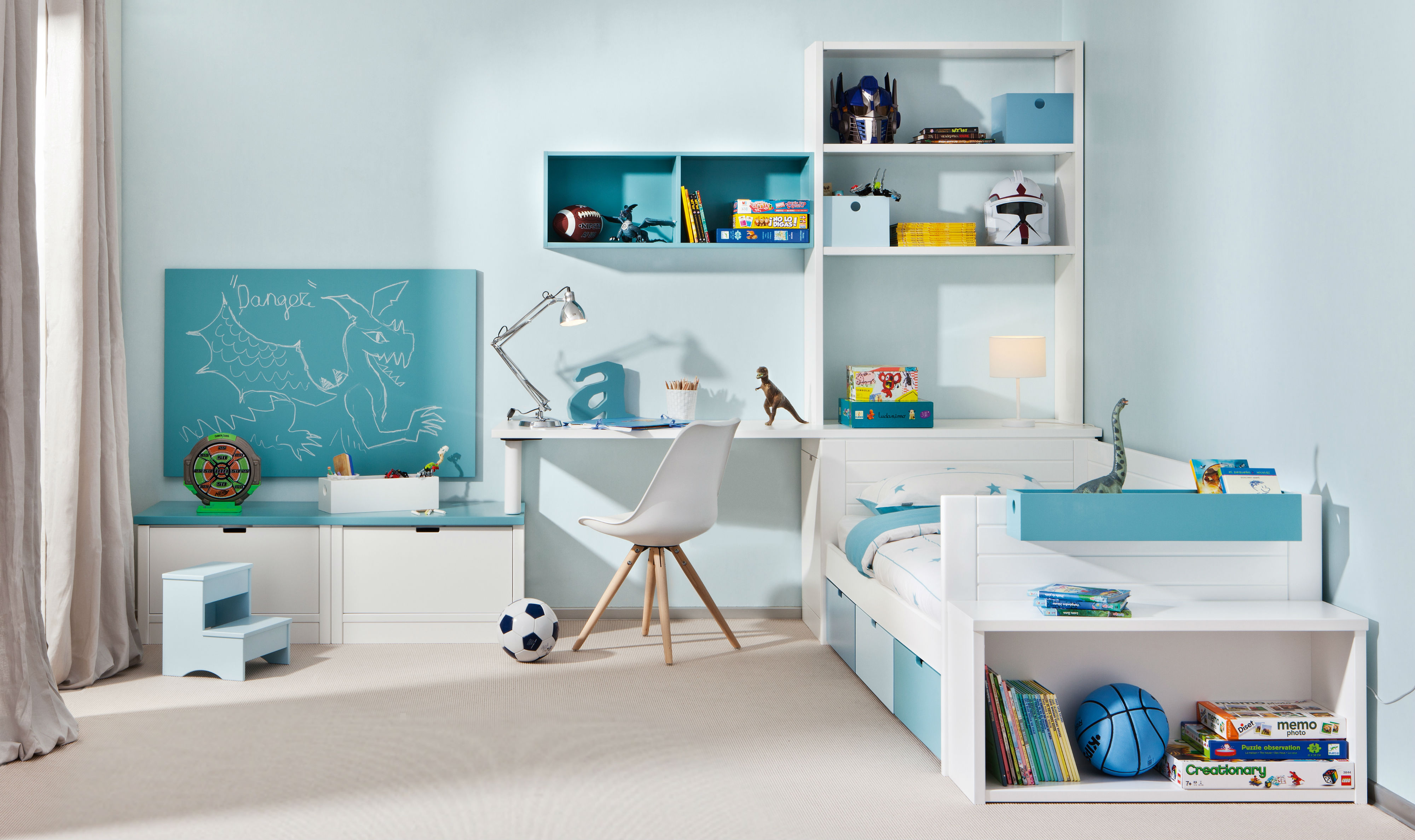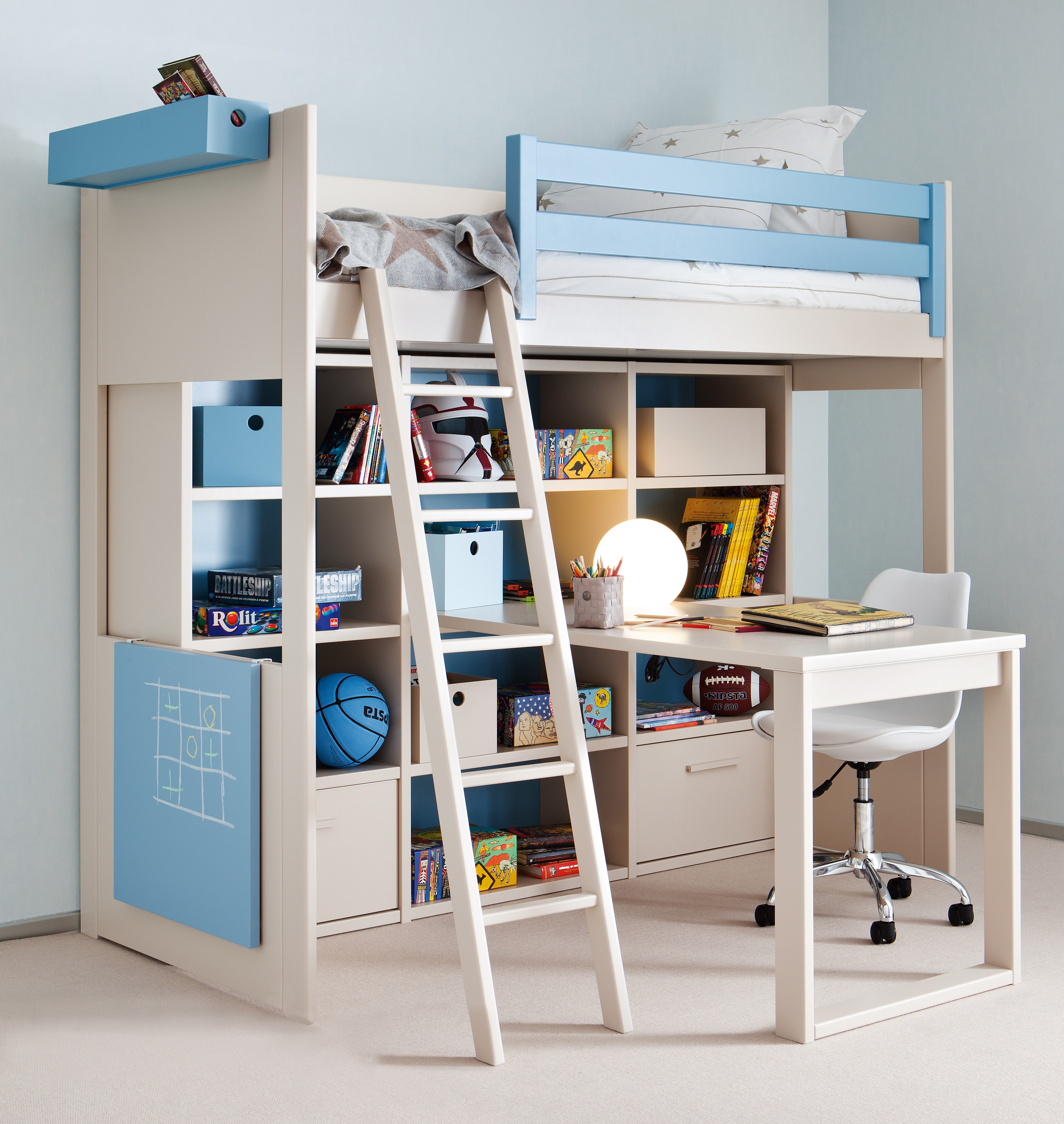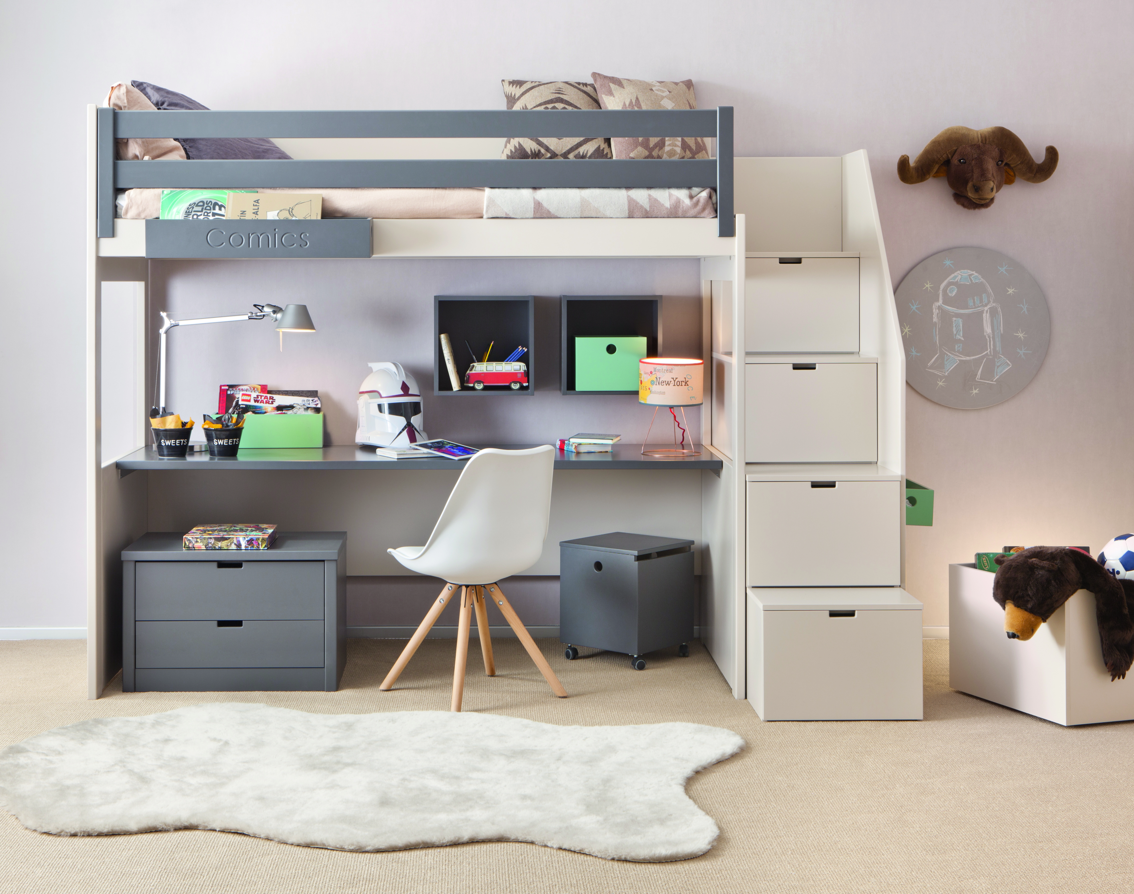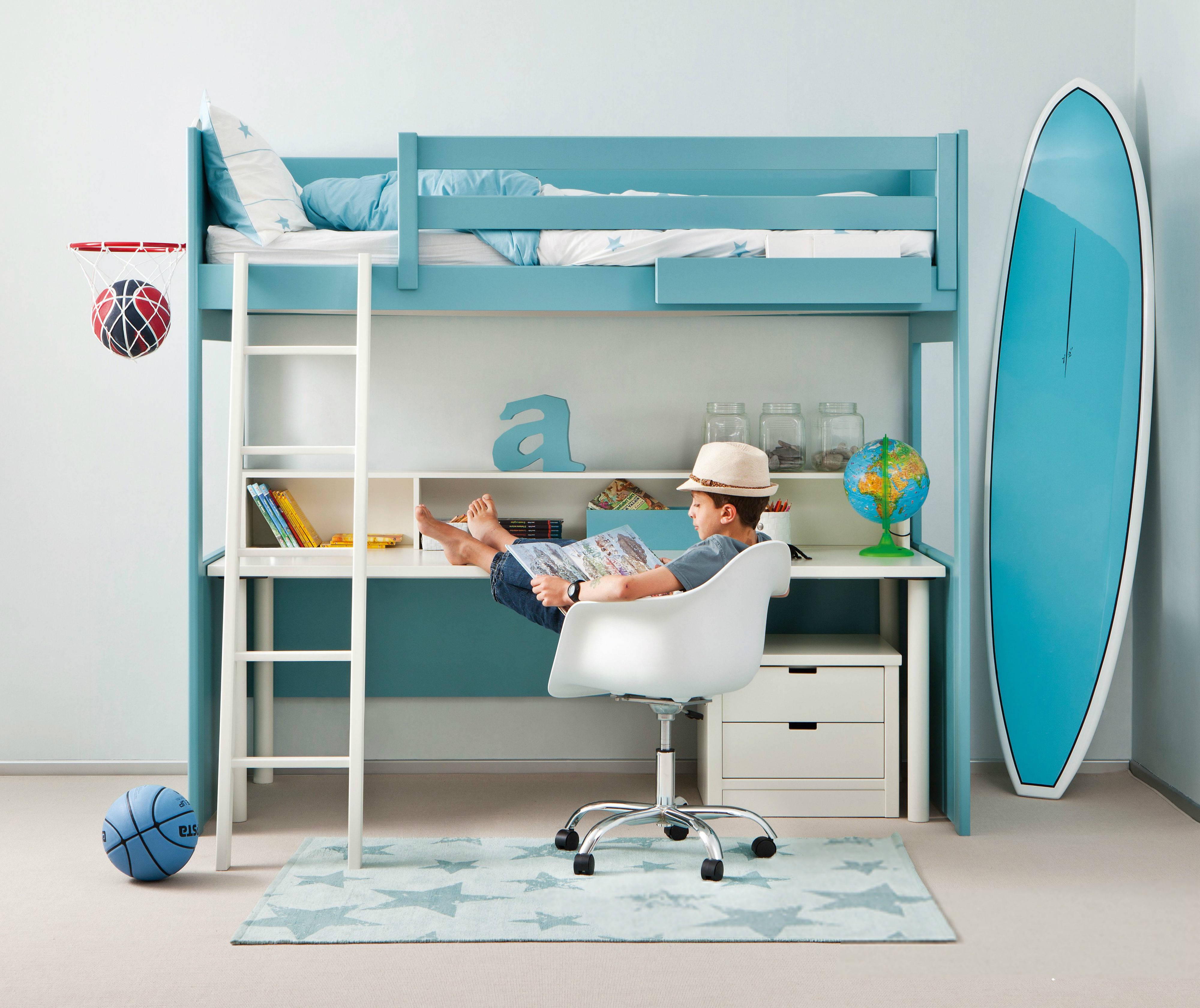 Radost větším dětem obvykle udělají v pokoji i tlumenější a méně „dětské“ barvy a naprostým hitem bývá vysoká postel, která jim navíc v pokojíku ušetří mnoho vzácného místa: při šikovném řešení lze ostatně pracovní kout umístit právě pod ní. A sestavu doplnit třeba úložnými schody se šuplíky.