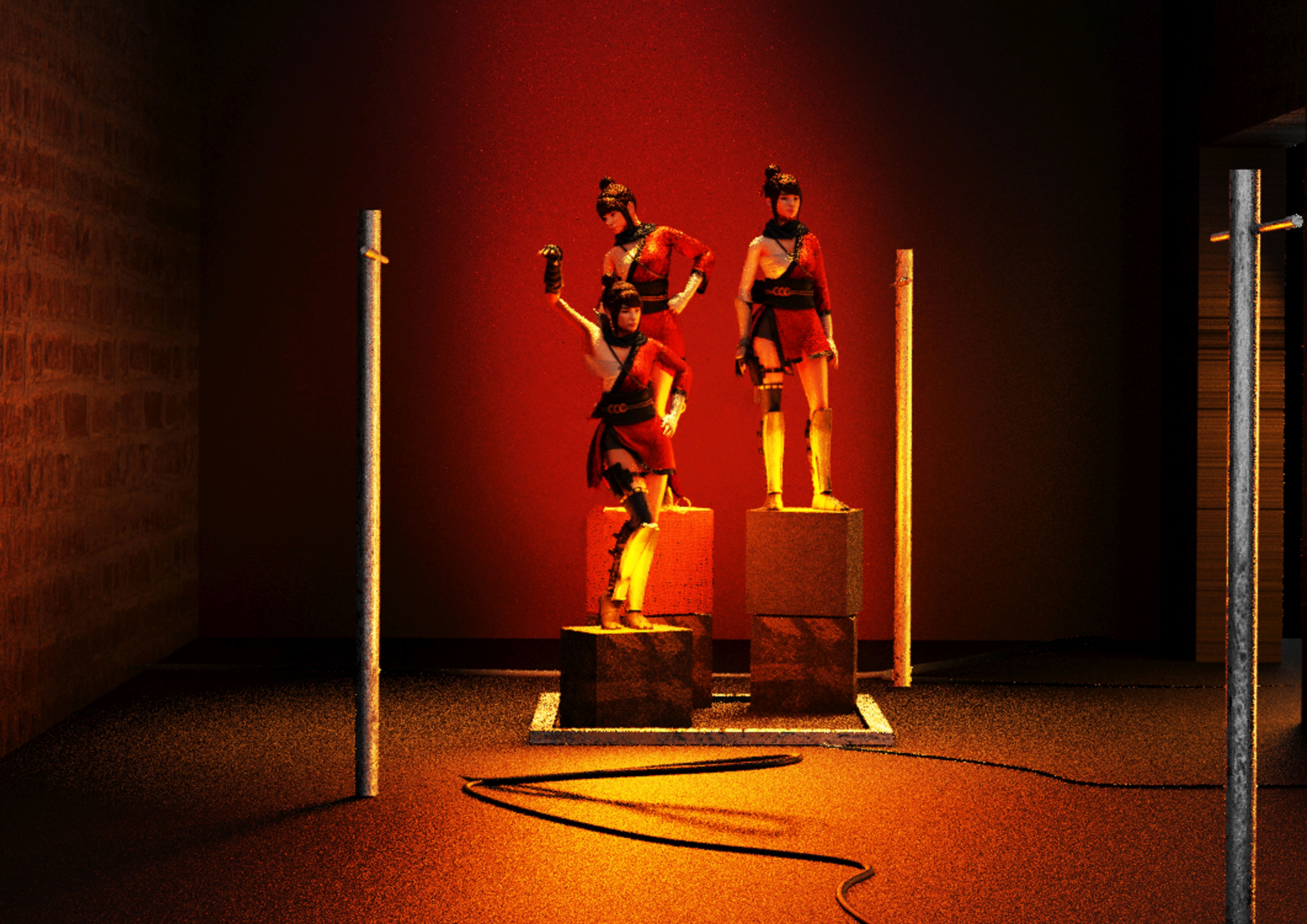 Napětí a současně i propojení mezi starým a novým světem odráží i nadčasová scénografie Ruslany Basenko. Ta zahrnuje i „pískoviště“ – prostor vyplněný hlínou. „Vše ze země vyrůstá a vše se do ní zase vrací. Pískovištěm tak odkazujeme k cykličnosti dějin, ale i k archeologii a ke snaze hrdinek vyhrabat alespoň nějaké pozůstatky ze svého starého života,“ říká Basenko. Oporu v novém prostředí symbolizují dřevěné pilíře se změtí kabelů. Jejich rozplétání je pak podle scénografky v souladu s tím, jak k sobě jednotlivé hrdinky hledají cestu.