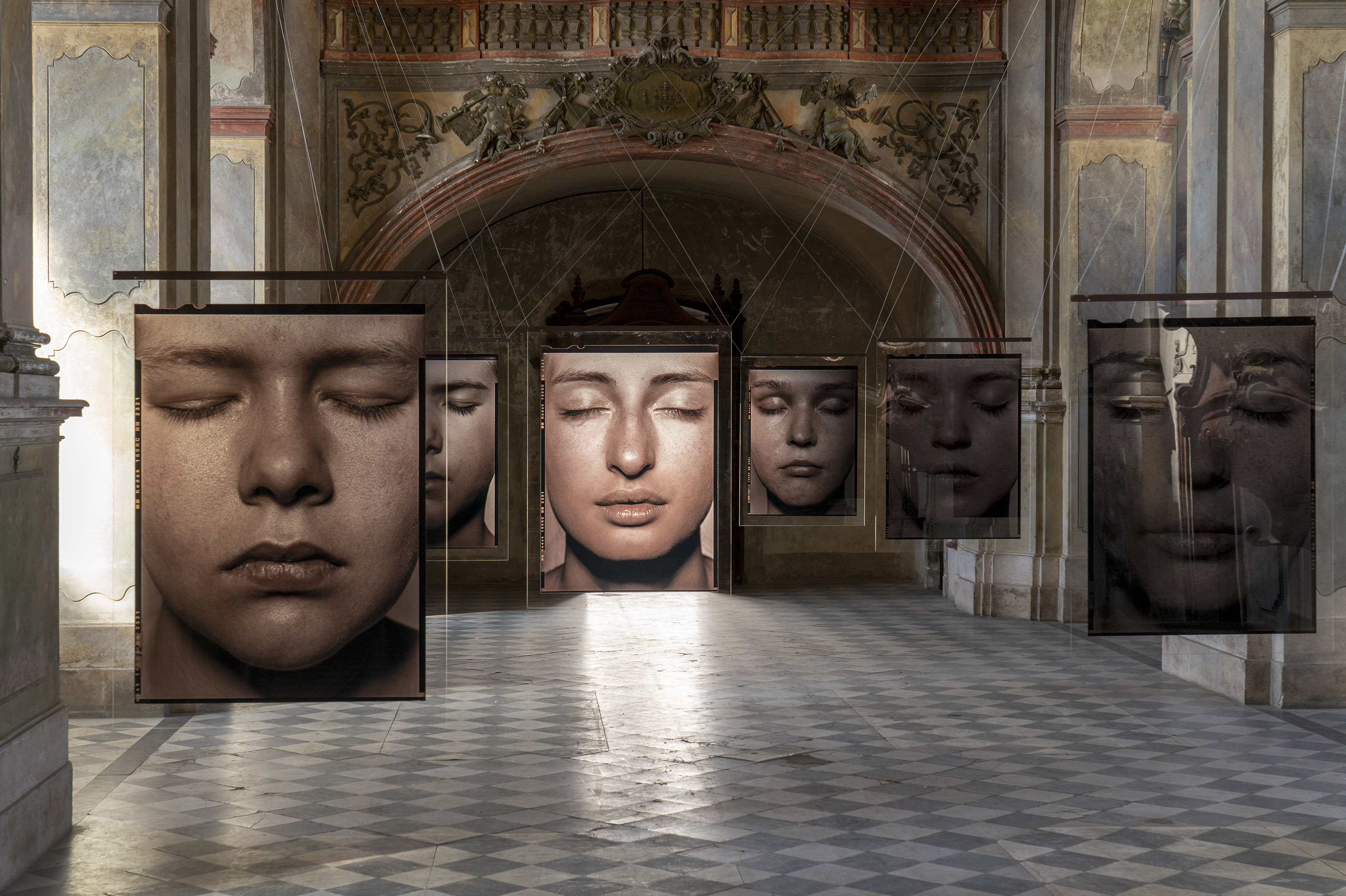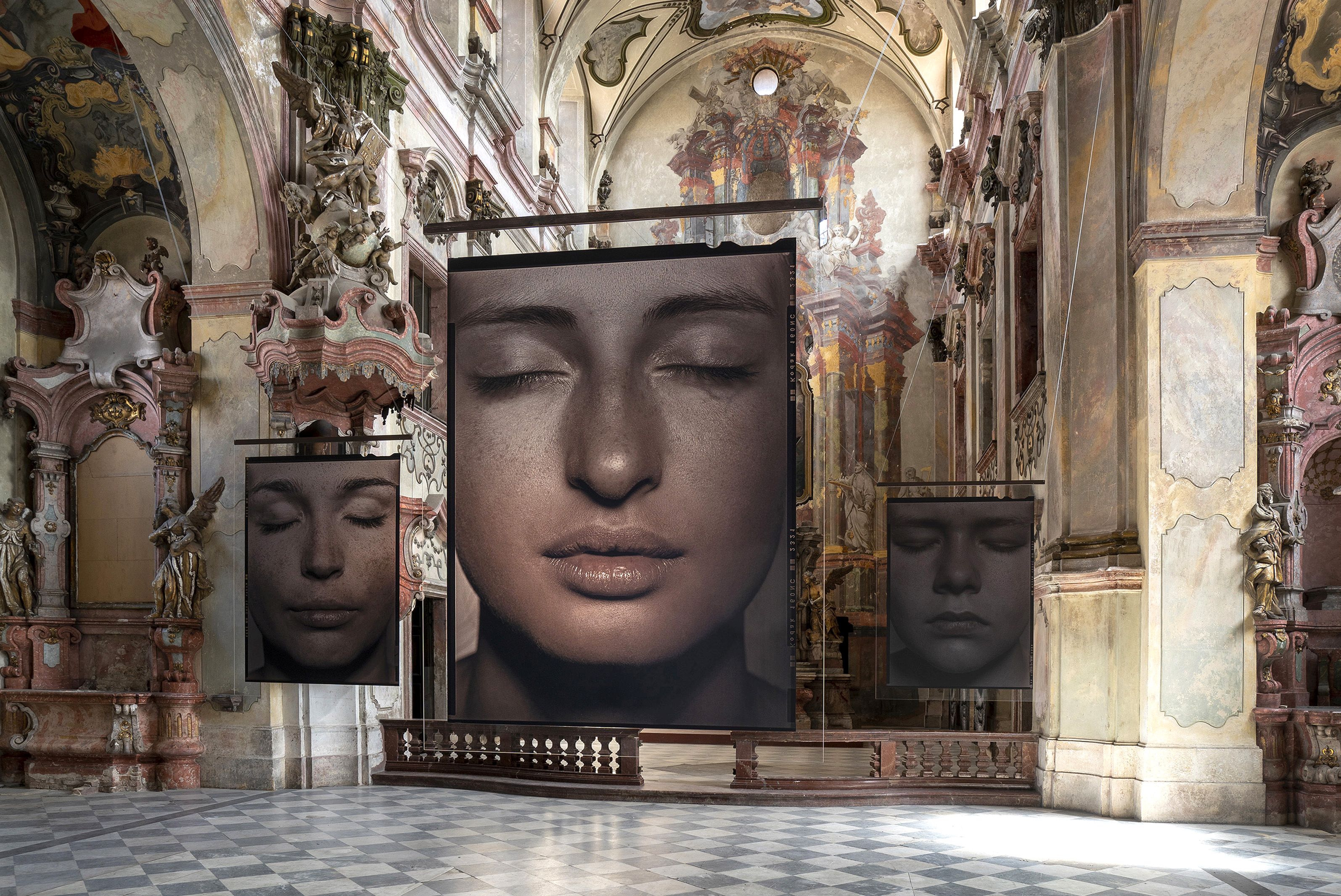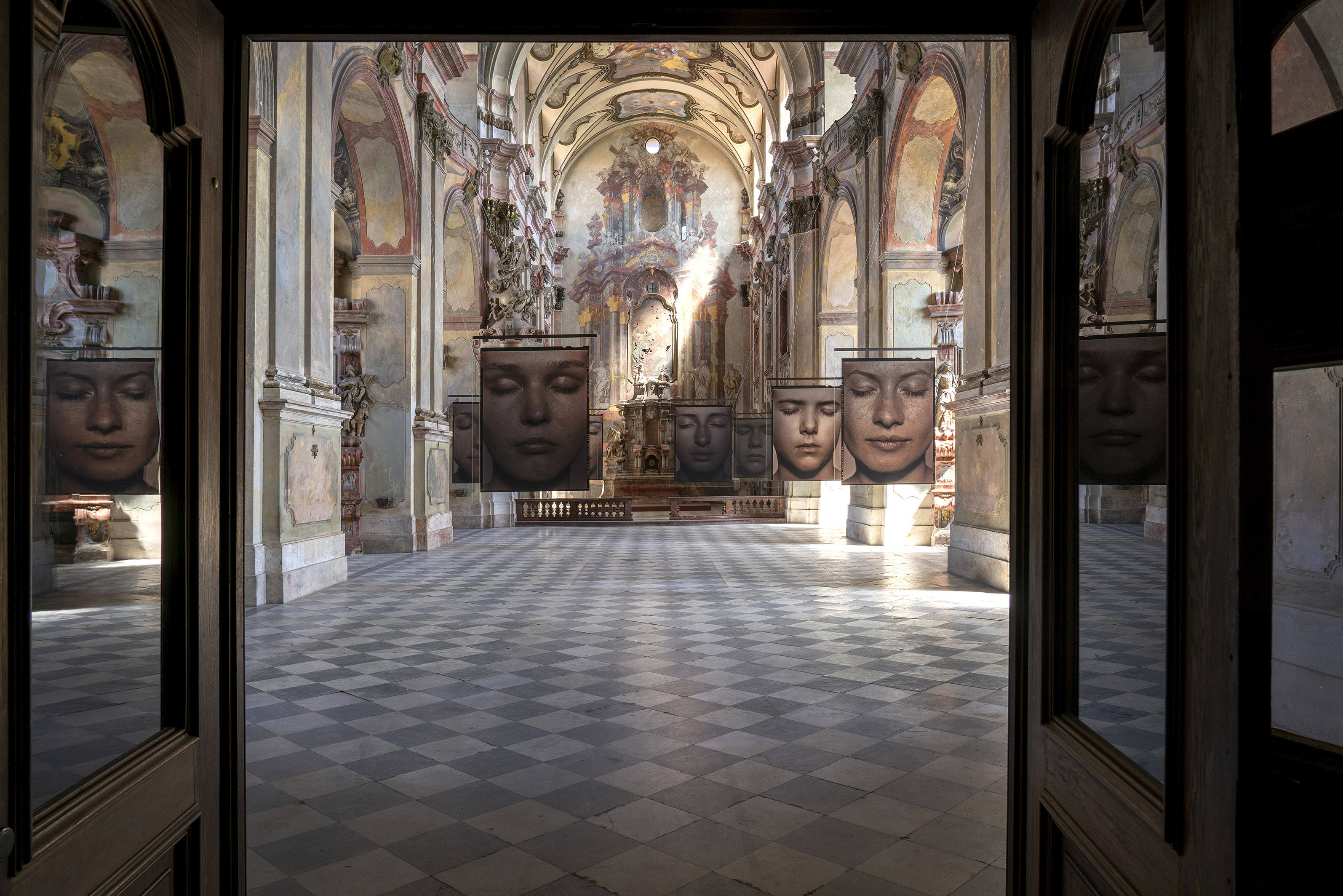Expozici vévodí osm fascinujících portrétů mladých žen zavěšených v hlavní chrámové lodi: snímky z cyklu Tváře (2012-14) byly zatím vystaveny jen jako negativy tištěné na plátně, autor je zde ale poprvé „překlopil“ do pozitivů a nechal vytisknout na – v umělecké fotografii zřídka používaná – průhledná plexiskla. Fotografie, z jedné strany matné a z druhé lesklé, tak fungují jako obrazy i zrcadla zároveň. „Nápad s plexiskly mi ale málem nevyšel, protože je začali v prodejnách využívat jako ochranu před koronavirem. Naštěstí jsme všechny tisky stihli těsně před tím, než tento materiál zmizel z trhu,“ říká Pavel Mára.