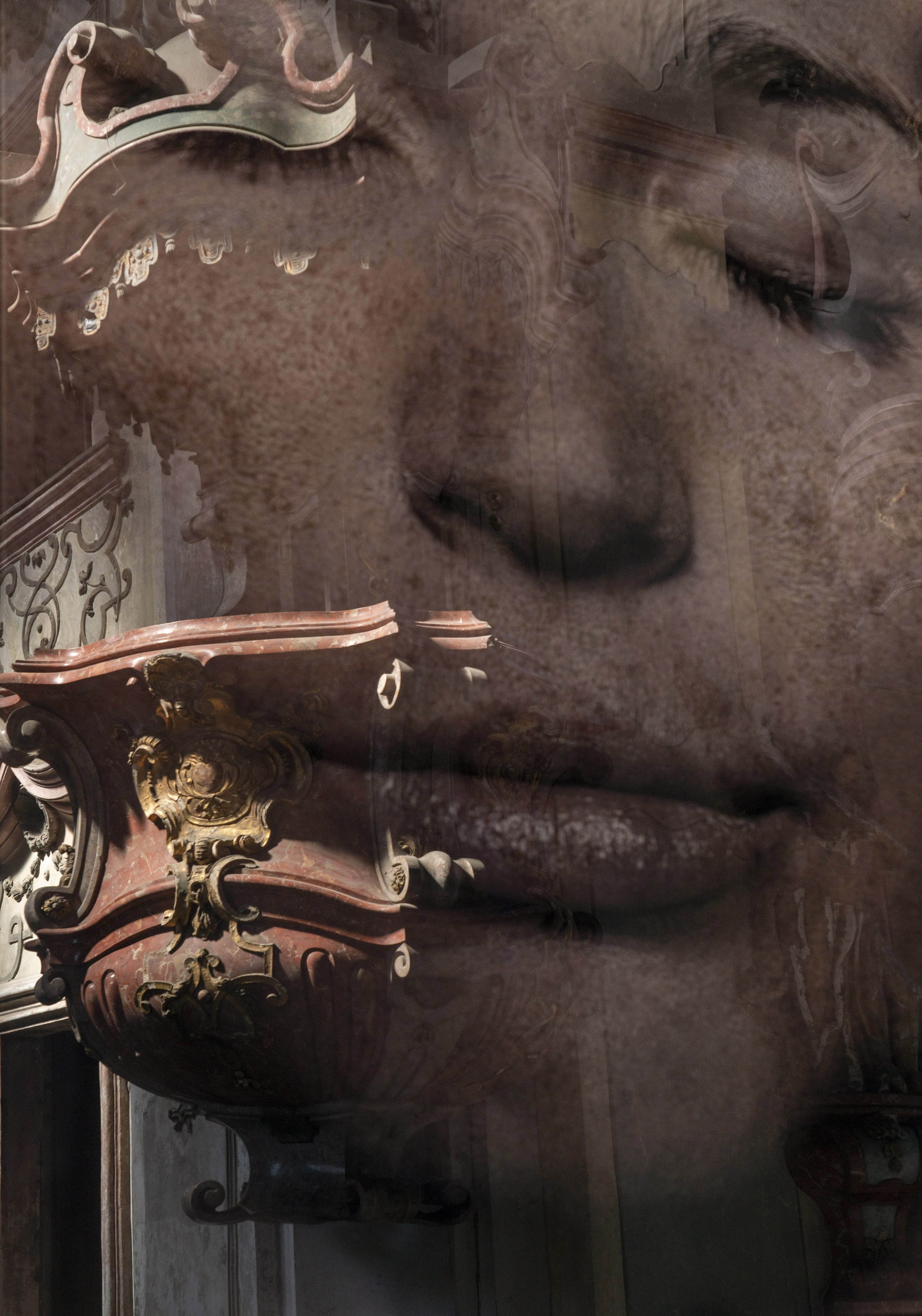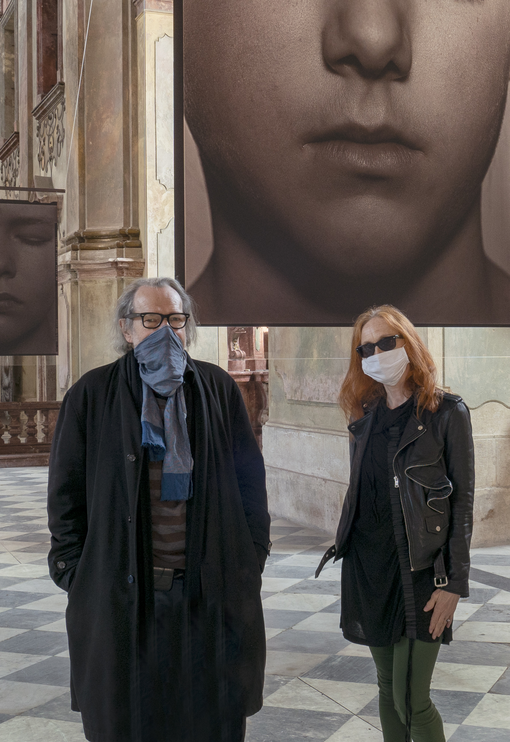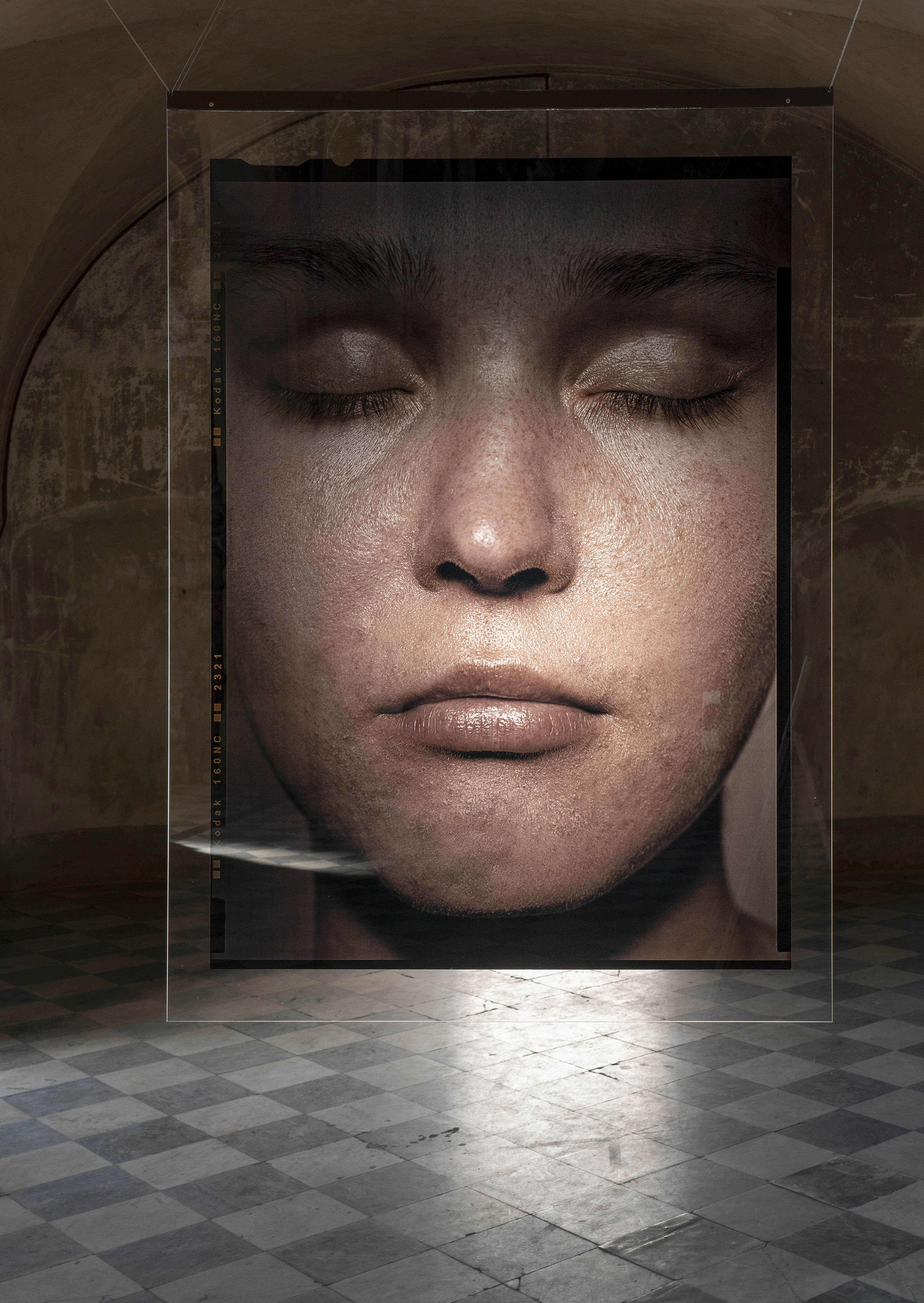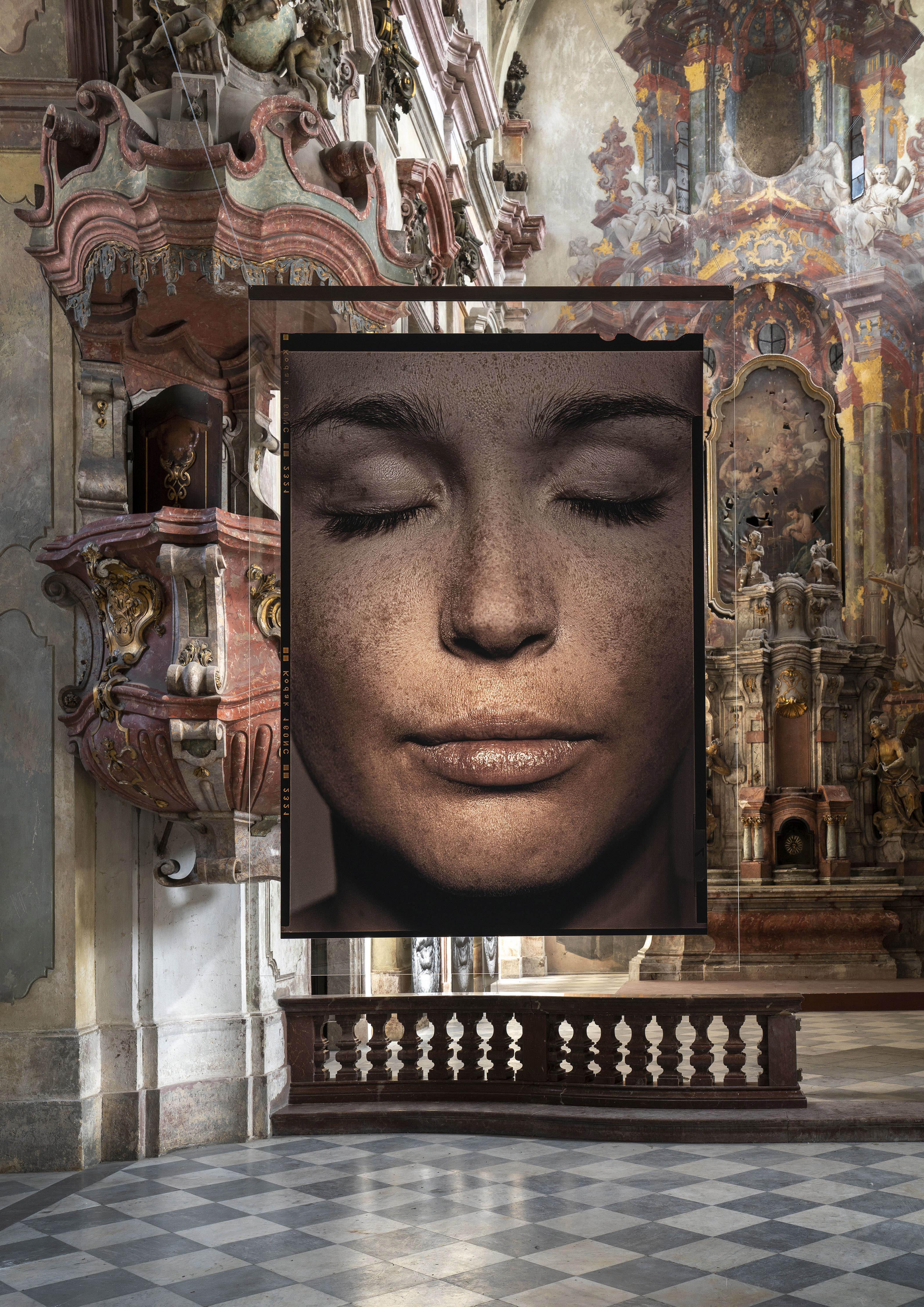 Expozici vévodí osm fascinujících portrétů mladých žen zavěšených v hlavní chrámové lodi: snímky z cyklu Tváře (2012-14) byly zatím vystaveny jen jako negativy tištěné na plátně, autor je zde ale poprvé „překlopil“ do pozitivů a nechal vytisknout na – v umělecké fotografii zřídka používaná – průhledná plexiskla. Fotografie, z jedné strany matné a z druhé lesklé, tak fungují jako obrazy i zrcadla zároveň. „Nápad s plexiskly mi ale málem nevyšel, protože je začali v prodejnách využívat jako ochranu před koronavirem. Naštěstí jsme všechny tisky stihli těsně před tím, než tento materiál zmizel z trhu,“ říká Pavel Mára.