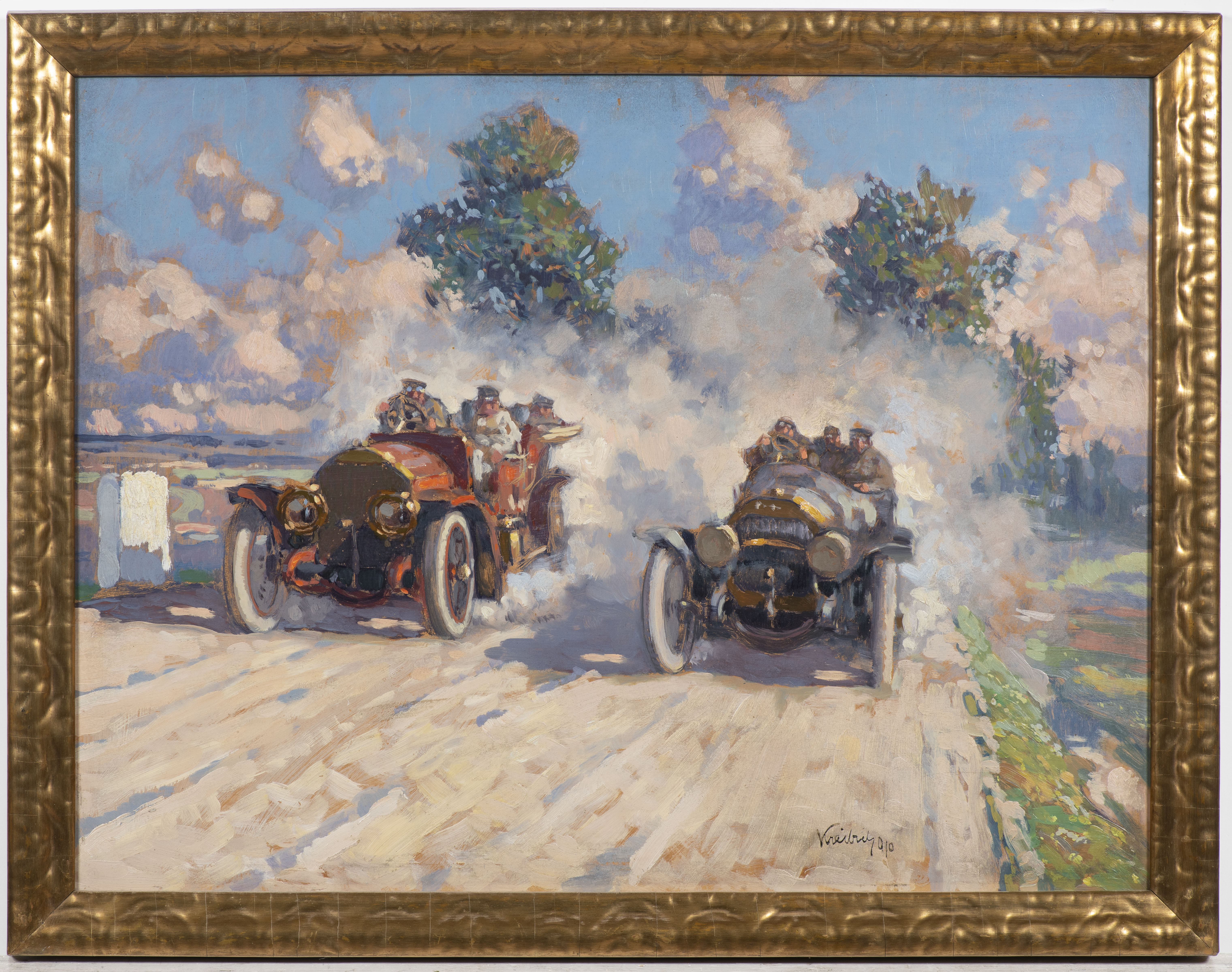 Sběratelsky přitažlivý bude určitě Přímý souboj (1910) od Viléma Kreibicha, proslulého malíře lokomotiv. Dvě bugattky řítící se vpřed v oblaku kouře budou draženy už od 60 000 korun, což slibuje napínavý aukční souboj.