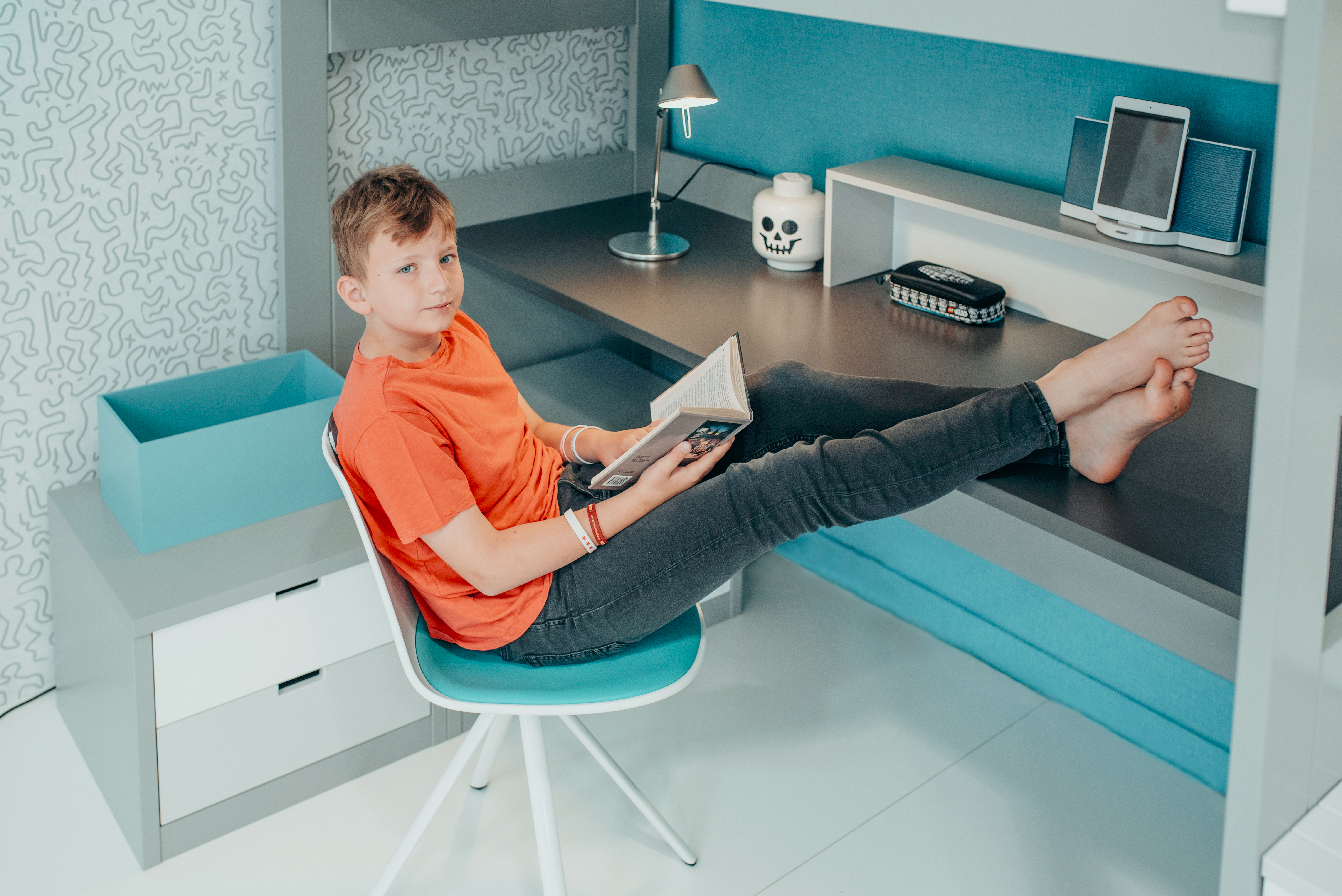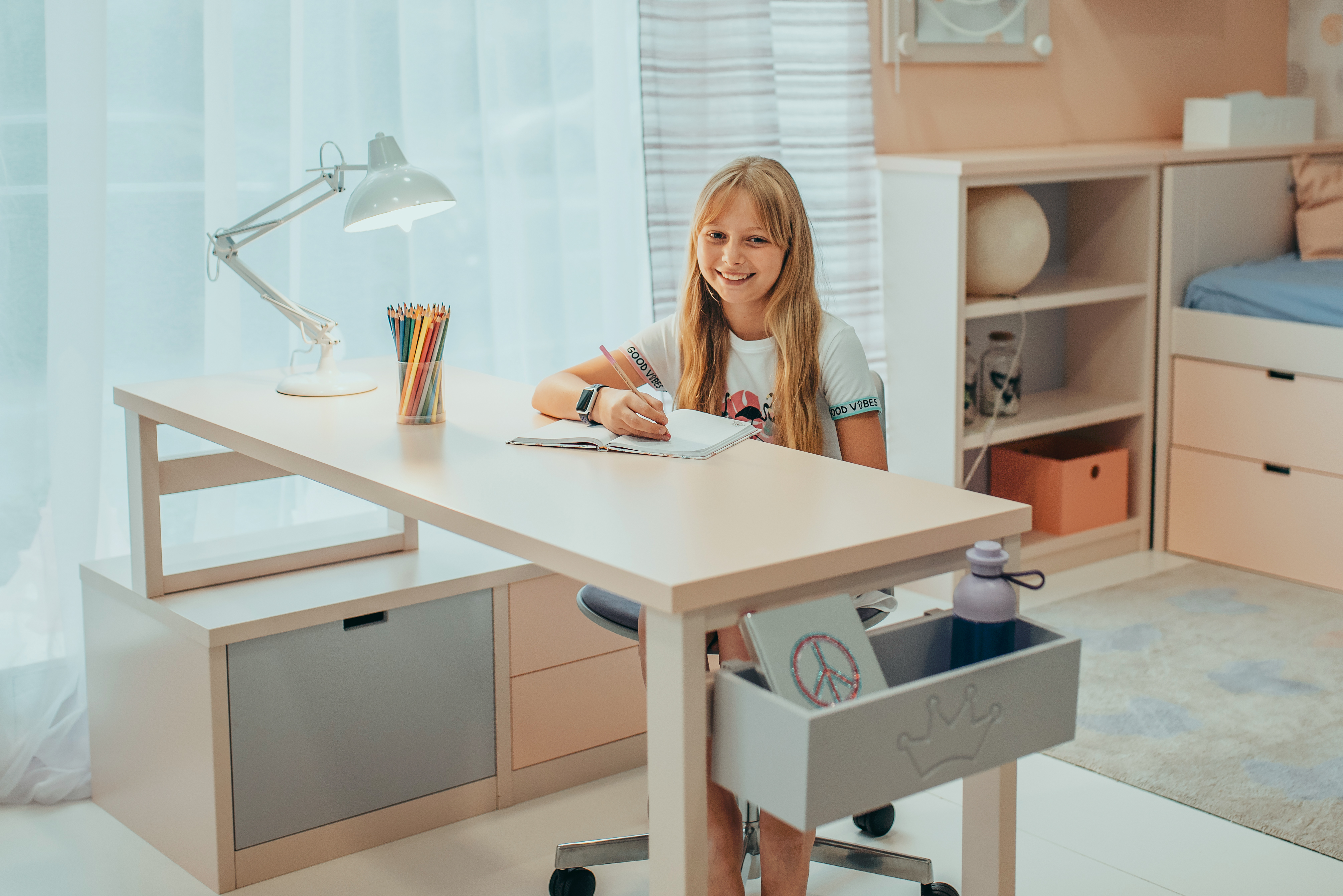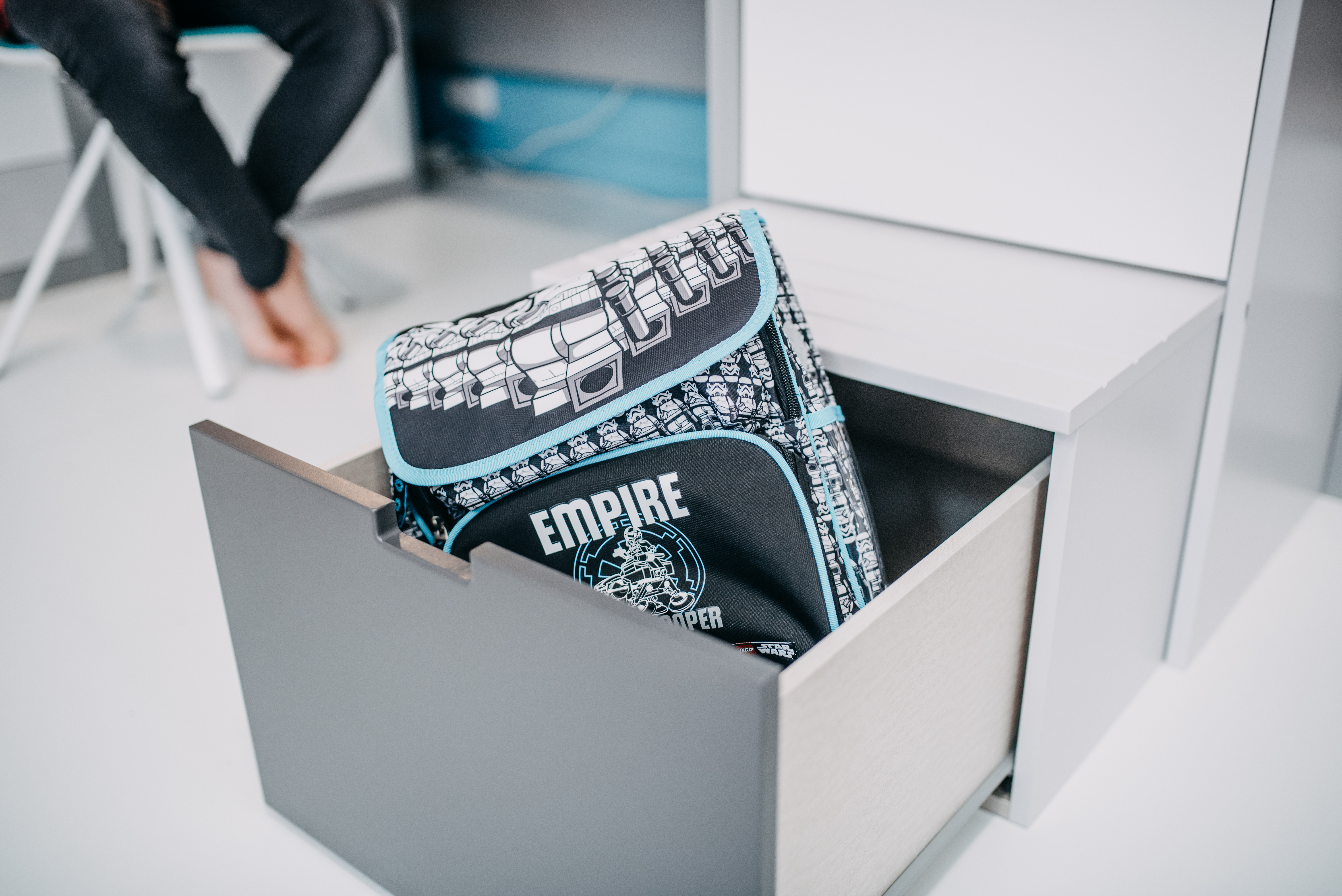 Zásadní pro zdárné studium je dostatek místa na učebnice a školní potřeby. Oblíbené jsou jezdící kontejnery pod stůl. Výborně ale poslouží i hranaté boxy k zavěšení na kraj stolu, na hranu skříňky nebo postele. Na očích a hezky uspořádané tu mohou čekat pastelky, pravítka a další drobnosti. „Zejména v případě starších dětí a teenagerů můžeme „uklidit“ dokonce i celý pracovní kout, pokud ho umístíme například pod vysokou postel a jako úložné prostory využijeme třeba schody s vysouvacími šuplíky,“ říká Šárka Richtrová ze studia Viabel.