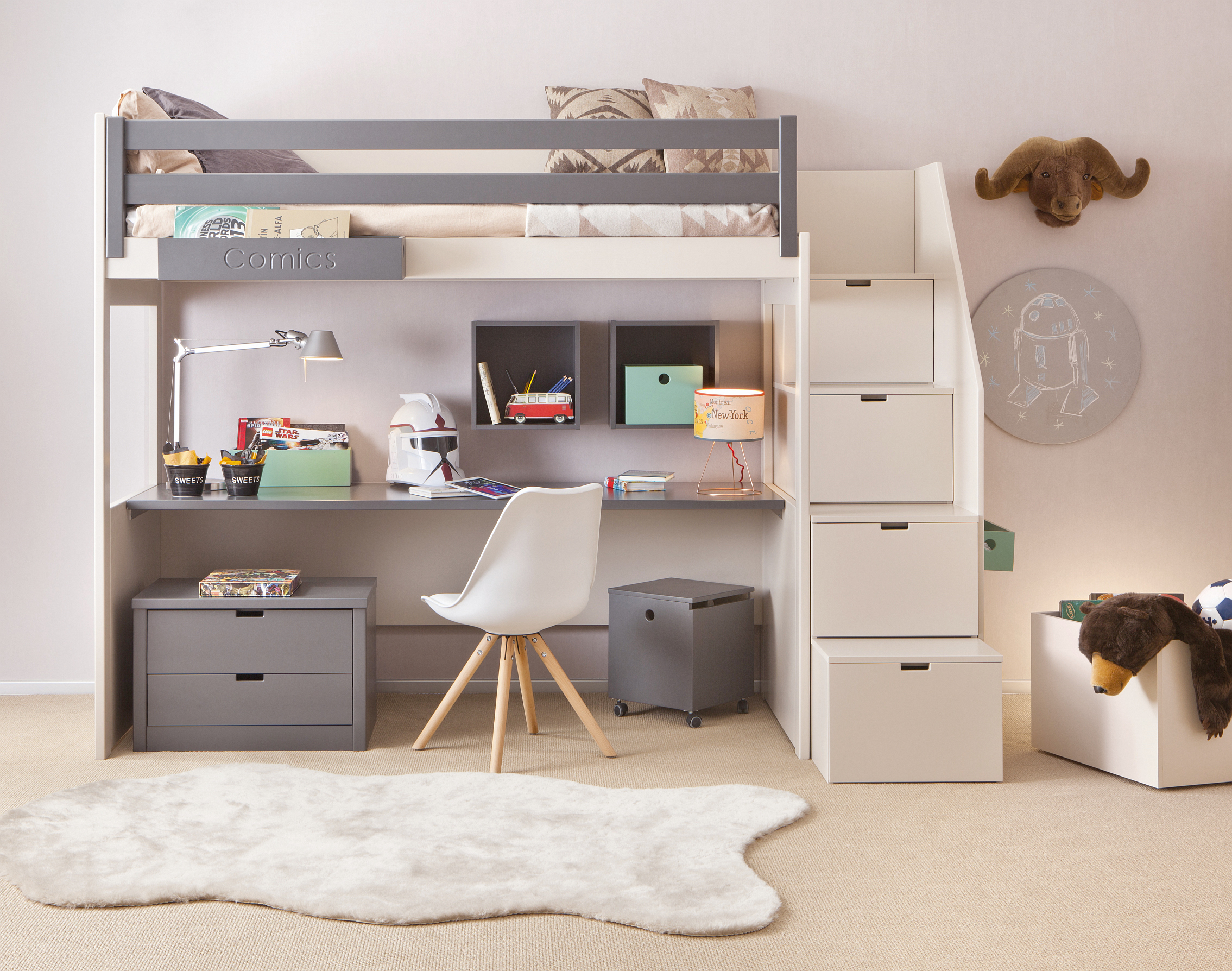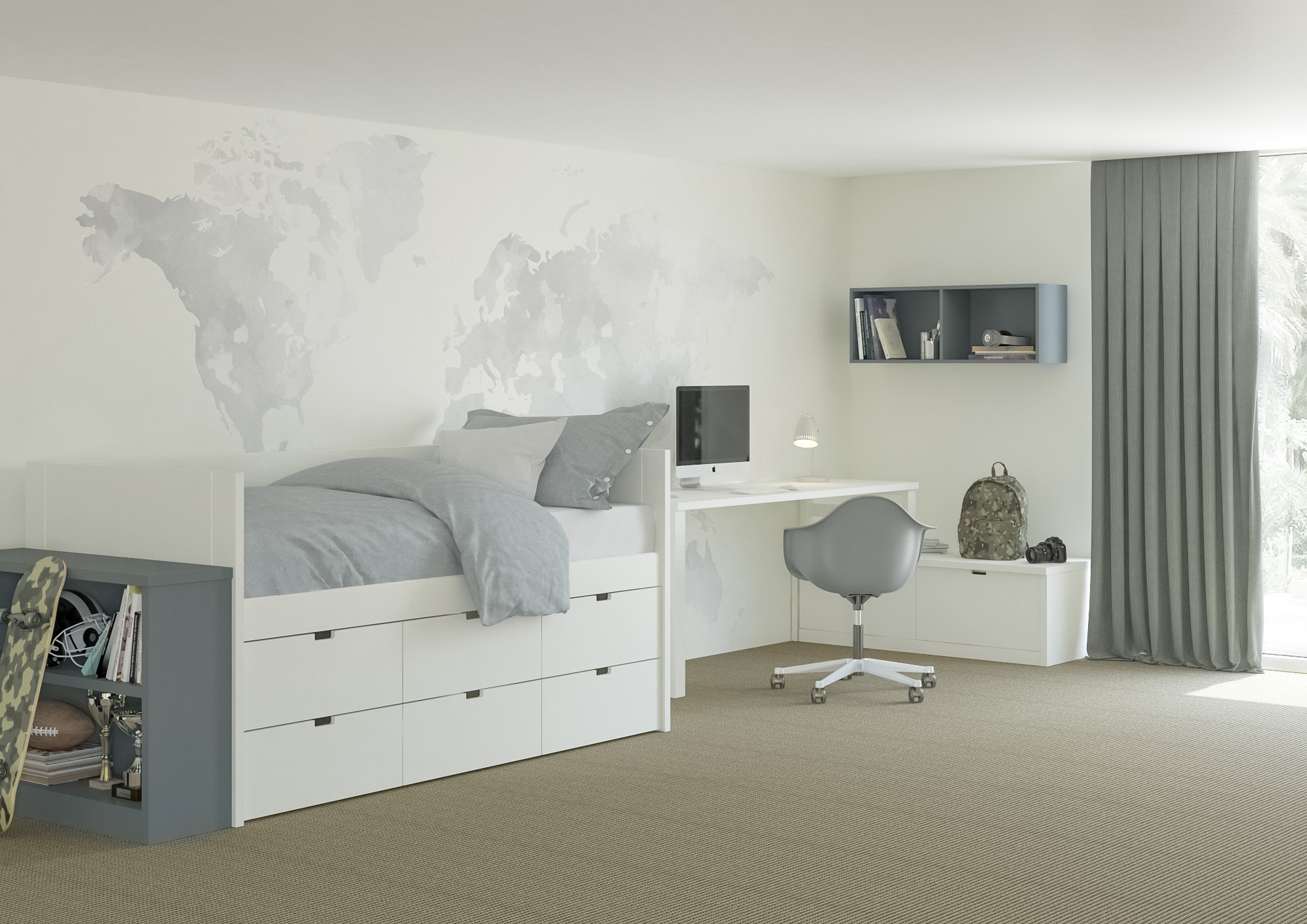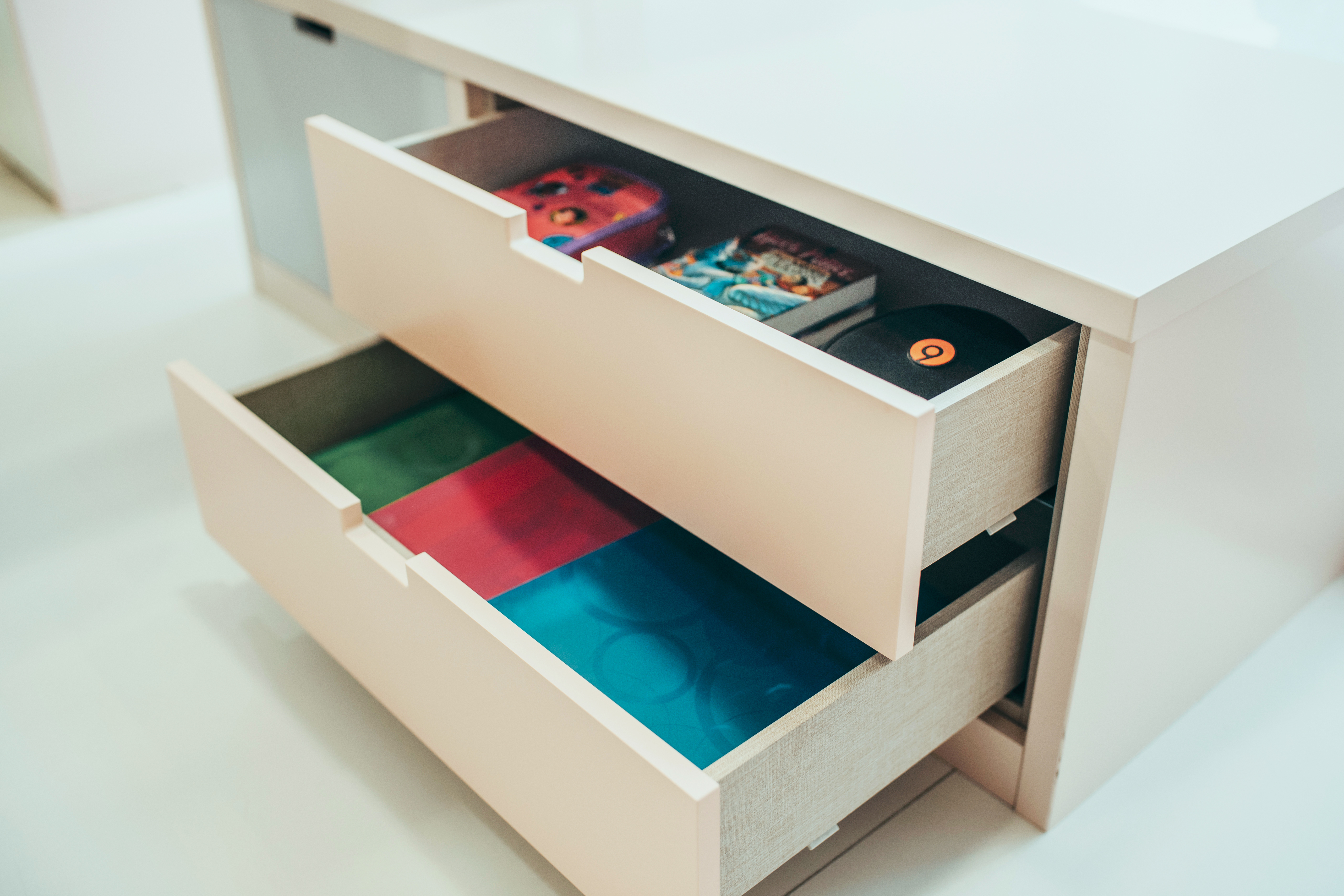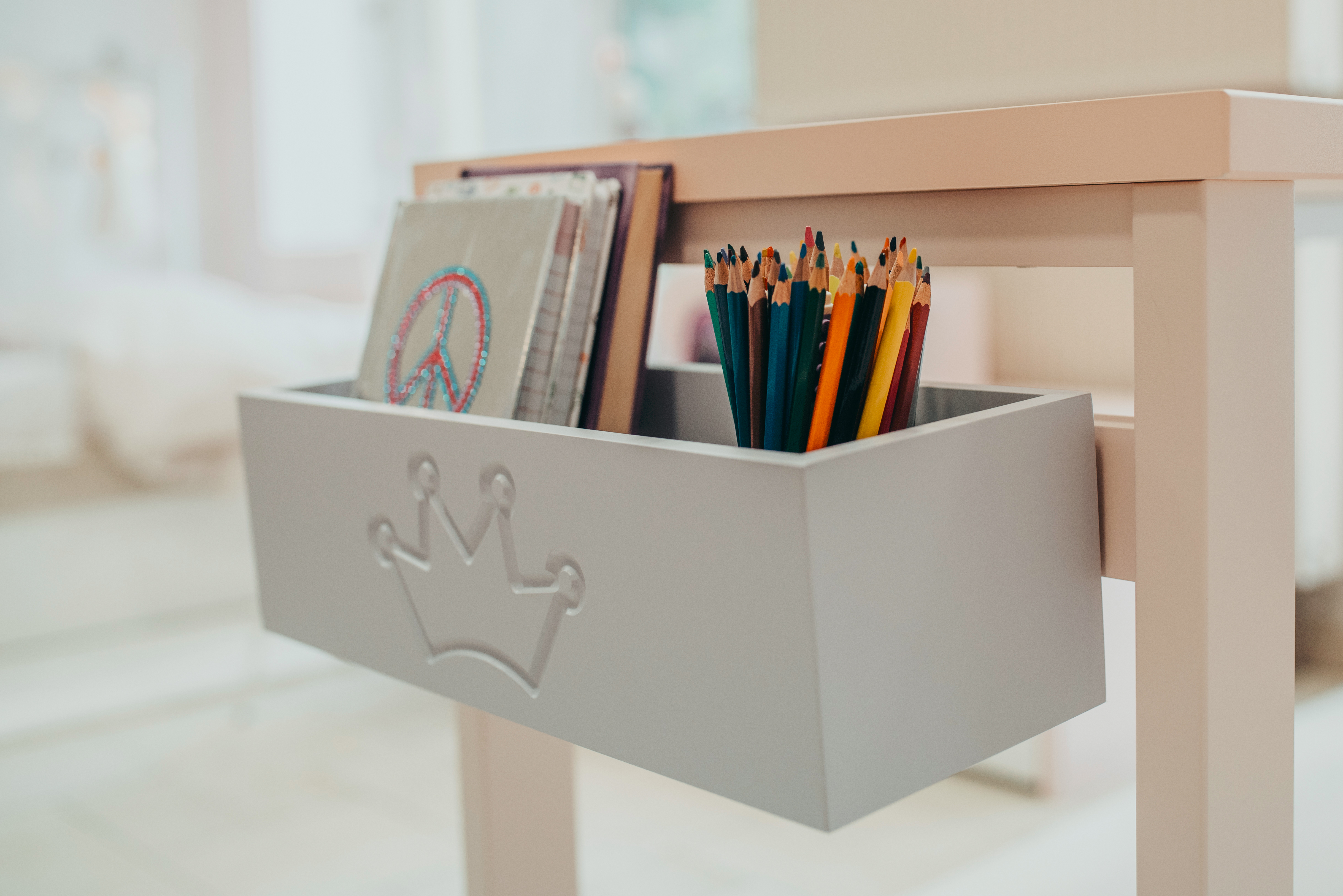 Zásadní pro zdárné studium je dostatek místa na učebnice a školní potřeby. Oblíbené jsou jezdící kontejnery pod stůl. Výborně ale poslouží i hranaté boxy k zavěšení na kraj stolu, na hranu skříňky nebo postele. Na očích a hezky uspořádané tu mohou čekat pastelky, pravítka a další drobnosti. „Zejména v případě starších dětí a teenagerů můžeme „uklidit“ dokonce i celý pracovní kout, pokud ho umístíme například pod vysokou postel a jako úložné prostory využijeme třeba schody s vysouvacími šuplíky,“ říká Šárka Richtrová ze studia Viabel.